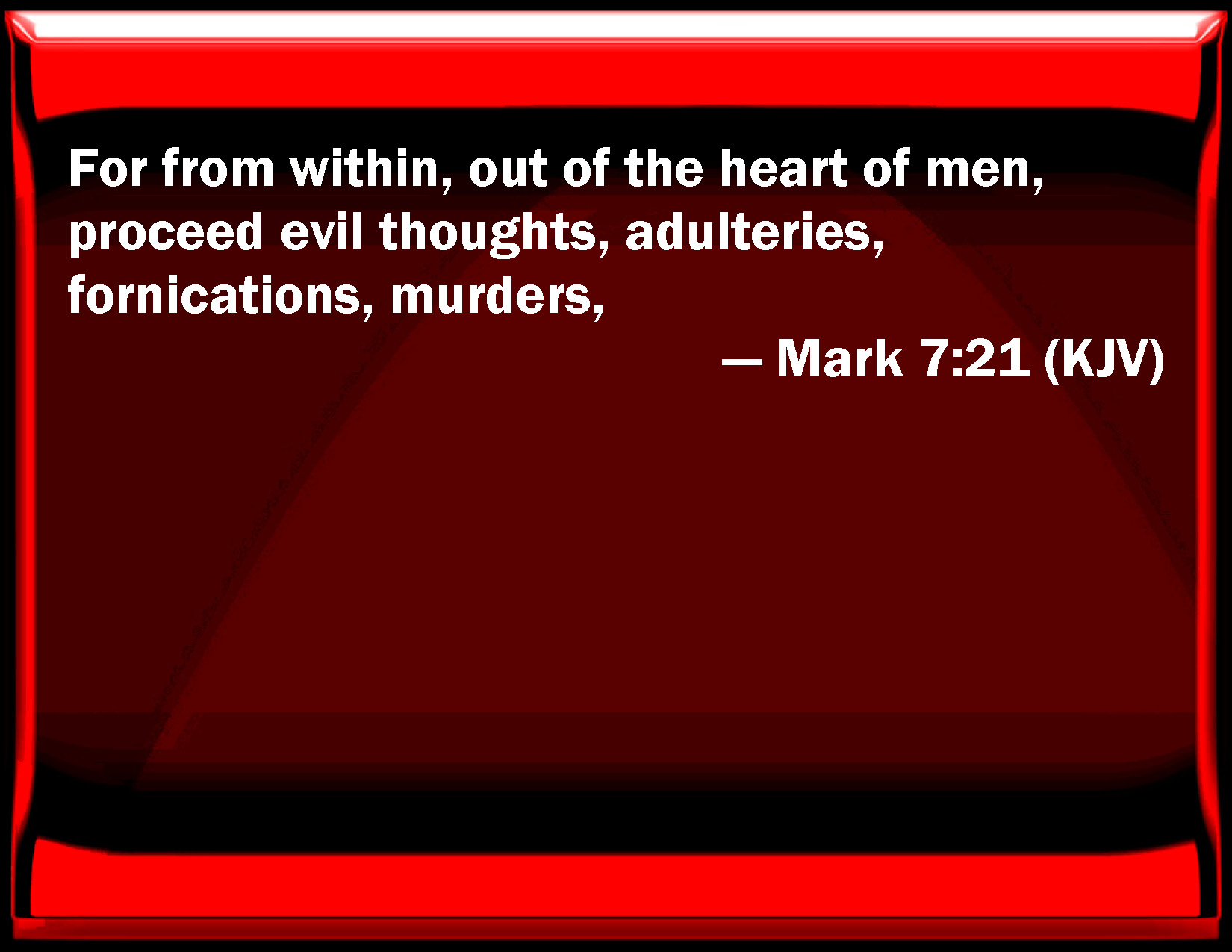 Bible Verse Slide Mark 7:21 For from within, out of the heart of men, proceed evil thoughts, adulteries, fornications, murders, KJV: For from within, out of the heart of men, proceed evil thoughts, adulteries, fornications, murders, DRB: For from within out of the heart of men proceed evil thoughts, adulteries, fornications, murders, DBT: For from within, out of the heart of men, go forth evil thoughts, adulteries, fornications, murders, ERV: For from within, out of the heart of men, evil thoughts proceed, fornications, thefts, murders, adulteries, WBT: For from within, out of the heart of men, proceed evil thoughts, adulteries, fornications, murders, WEB: For from within, out of the hearts of men, proceed evil thoughts, adulteries, sexual sins, murders, thefts, YLT: for from within, out of the heart of men, the evil reasonings do come forth, adulteries, whoredoms, murders,Links Mark 7:21 NIV • Mark 7:21 NLT • Mark 7:21 ESV • Mark 7:21 NASB • Mark 7:21 KJV • Mark 7:21 Interlinear • Mark 7:21 Commentaries • Mark 7:21 Parallel Texts • Mark 7:21 Bible Apps • Mark 7:21 Parallel • Bible Hub |