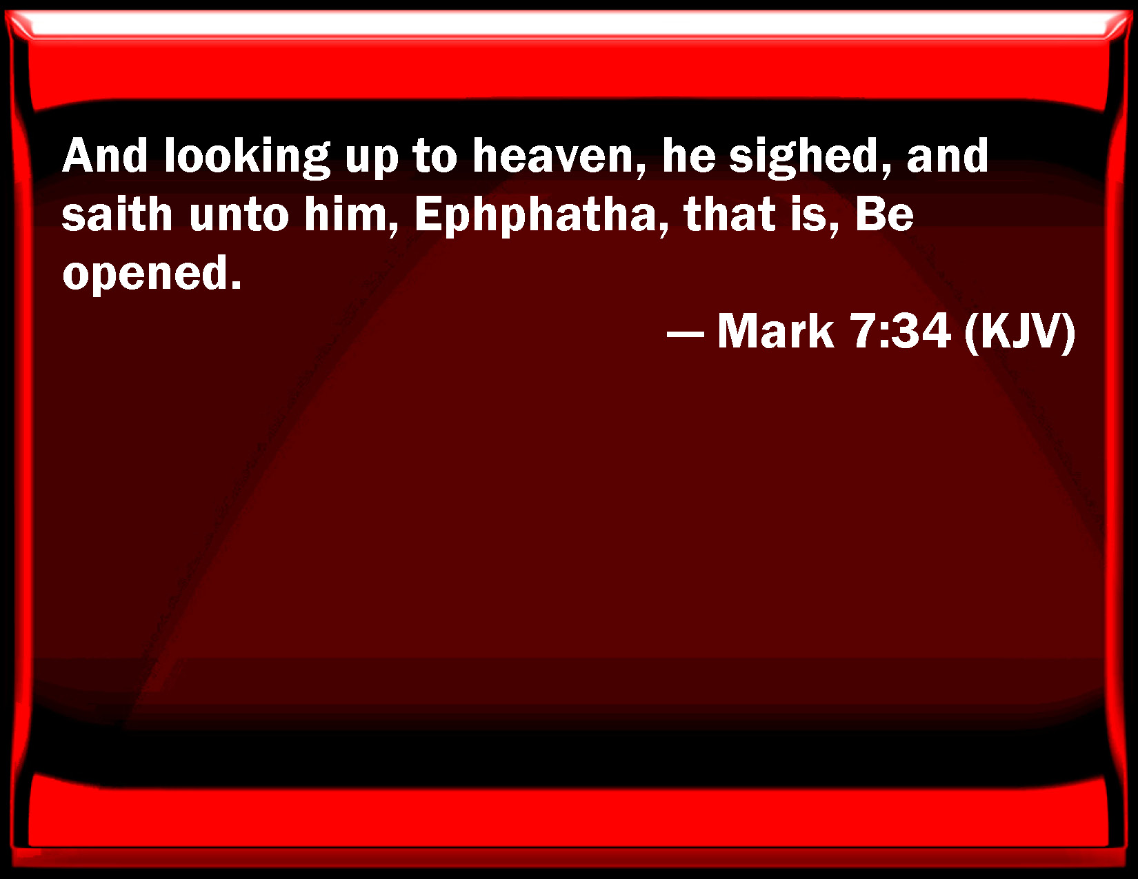 Bible Verse Slide Mark 7:34 And looking up to heaven, he sighed, and said to him, Ephphatha, that is, Be opened. KJV: And looking up to heaven, he sighed, and saith unto him, Ephphatha, that is, Be opened. DRB: And looking up to heaven, he groaned, and said to him: Ephpheta, which is, Be thou opened. DBT: and looking up to heaven he groaned, and says to him, Ephphatha, that is, Be opened. ERV: and looking up to heaven, he sighed, and saith unto him, Ephphatha, that is, Be opened. WBT: And looking up to heaven, he sighed, and saith to him, Effatha, that is, Be opened. WEB: Looking up to heaven, he sighed, and said to him, "Ephphatha!" that is, "Be opened!" YLT: and having looked to the heaven, he sighed, and saith to him, 'Ephphatha,' that is, 'Be thou opened;'Links Mark 7:34 NIV • Mark 7:34 NLT • Mark 7:34 ESV • Mark 7:34 NASB • Mark 7:34 KJV • Mark 7:34 Interlinear • Mark 7:34 Commentaries • Mark 7:34 Parallel Texts • Mark 7:34 Bible Apps • Mark 7:34 Parallel • Bible Hub |