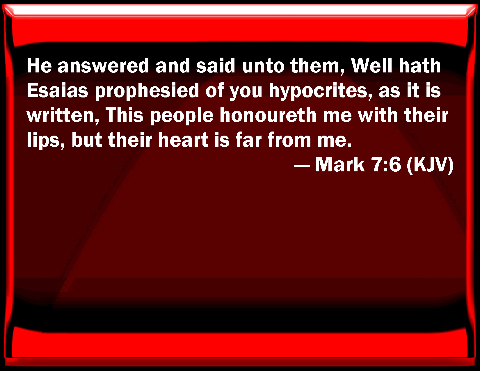 Bible Verse Slide Mark 7:6 He answered and said to them, Well has Esaias prophesied of you hypocrites, as it is written, This people honors me with their lips, but their heart is far from me. KJV: He answered and said unto them, Well hath Esaias prophesied of you hypocrites, as it is written, This people honoureth me with their lips, but their heart is far from me. DRB: But he answering, said to them: Well did Isaias prophesy of you hypocrites, as it is written: This people honoureth me with their lips, but their heart is far from me. DBT: But he answering said to them, Well did Esaias prophesy concerning you hypocrites, as it is written, This people honour me with their lips, but their heart is far away from me. ERV: And he said unto them, Well did Isaiah prophesy of you hypocrites, as it is written, This people honoureth me with their lips, But their heart is far from me. WBT: He answered and said to them, Well hath Isaiah prophesied concerning you hypocrites, as it is written, This people honoreth me with their lips, but their heart is far from me. WEB: He answered them, "Well did Isaiah prophesy of you hypocrites, as it is written, 'This people honors me with their lips, but their heart is far from me. YLT: and he answering said to them — 'Well did Isaiah prophesy concerning you, hypocrites, as it hath been written, This people with the lips doth honour Me, and their heart is far from Me;Links Mark 7:6 NIV • Mark 7:6 NLT • Mark 7:6 ESV • Mark 7:6 NASB • Mark 7:6 KJV • Mark 7:6 Interlinear • Mark 7:6 Commentaries • Mark 7:6 Parallel Texts • Mark 7:6 Bible Apps • Mark 7:6 Parallel • Bible Hub |