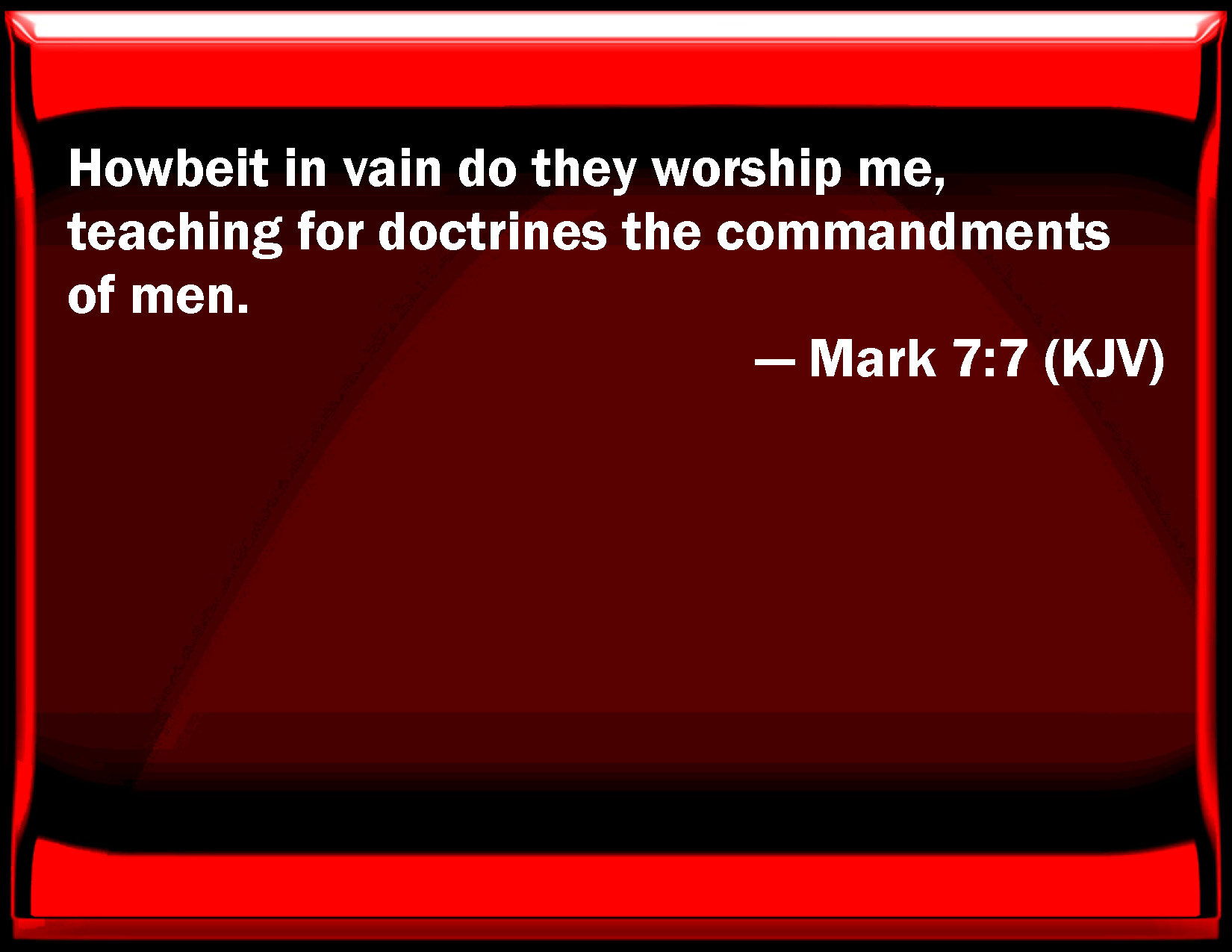 Bible Verse Slide Mark 7:7 However, in vain do they worship me, teaching for doctrines the commandments of men. KJV: Howbeit in vain do they worship me, teaching for doctrines the commandments of men. DRB: And in vain to they worship me, teaching doctrines and precepts of men. DBT: But in vain do they worship me, teaching as their teachings commandments of men. ERV: But in vain do they worship me, Teaching as their doctrines the precepts of men. WBT: But, in vain do they worship me, teaching for doctrines the commandments of men. WEB: But in vain do they worship me, teaching as doctrines the commandments of men.' YLT: and in vain do they worship Me, teaching teachings, commands of men;Links Mark 7:7 NIV • Mark 7:7 NLT • Mark 7:7 ESV • Mark 7:7 NASB • Mark 7:7 KJV • Mark 7:7 Interlinear • Mark 7:7 Commentaries • Mark 7:7 Parallel Texts • Mark 7:7 Bible Apps • Mark 7:7 Parallel • Bible Hub |