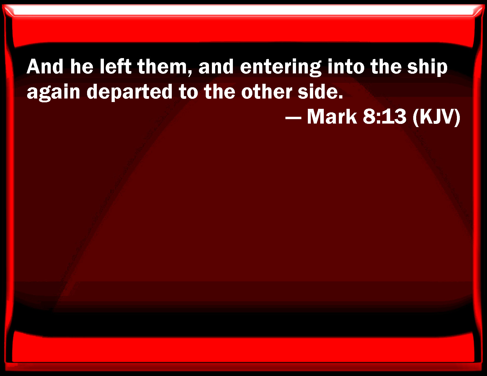 Bible Verse Slide Mark 8:13 And he left them, and entering into the ship again departed to the other side. KJV: And he left them, and entering into the ship again departed to the other side. DRB: And leaving them, he went up again into the ship, and passed to the other side of the water. DBT: And he left them, and going again on board ship, went away to the other side. ERV: And he left them, and again entering into the boat departed to the other side. WBT: And he left them, and entering into the boat again, departed to the other side. WEB: He left them, and again entering into the boat, departed to the other side. YLT: And having left them, having entered again into the boat, he went away to the other side;Links Mark 8:13 NIV • Mark 8:13 NLT • Mark 8:13 ESV • Mark 8:13 NASB • Mark 8:13 KJV • Mark 8:13 Interlinear • Mark 8:13 Commentaries • Mark 8:13 Parallel Texts • Mark 8:13 Bible Apps • Mark 8:13 Parallel • Bible Hub |
