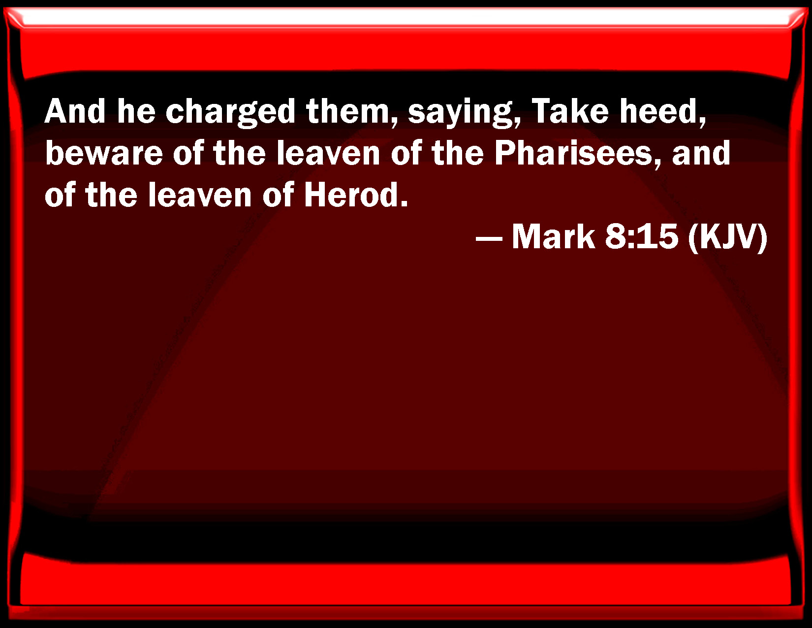 Bible Verse Slide Mark 8:15 And he charged them, saying, Take heed, beware of the leaven of the Pharisees, and of the leaven of Herod. KJV: And he charged them, saying, Take heed, beware of the leaven of the Pharisees, and of the leaven of Herod. DRB: And he charged them, saying: Take heed and beware of the leaven of the Pharisees, and of the leaven of Herod. DBT: And he charged them, saying, Take heed, beware of the leaven of the Pharisees and of the leaven of Herod. ERV: And he charged them, saying, Take heed, beware of the leaven of the Pharisees and the leaven of Herod. WBT: And he charged them saying, Take heed, beware of the leaven of the Pharisees, and of the leaven of Herod. WEB: He warned them, saying, "Take heed: beware of the yeast of the Pharisees and the yeast of Herod." YLT: and he was charging them, saying, 'Take heed, beware of the leaven of the Pharisees, and of the leaven of Herod,'Links Mark 8:15 NIV • Mark 8:15 NLT • Mark 8:15 ESV • Mark 8:15 NASB • Mark 8:15 KJV • Mark 8:15 Interlinear • Mark 8:15 Commentaries • Mark 8:15 Parallel Texts • Mark 8:15 Bible Apps • Mark 8:15 Parallel • Bible Hub |