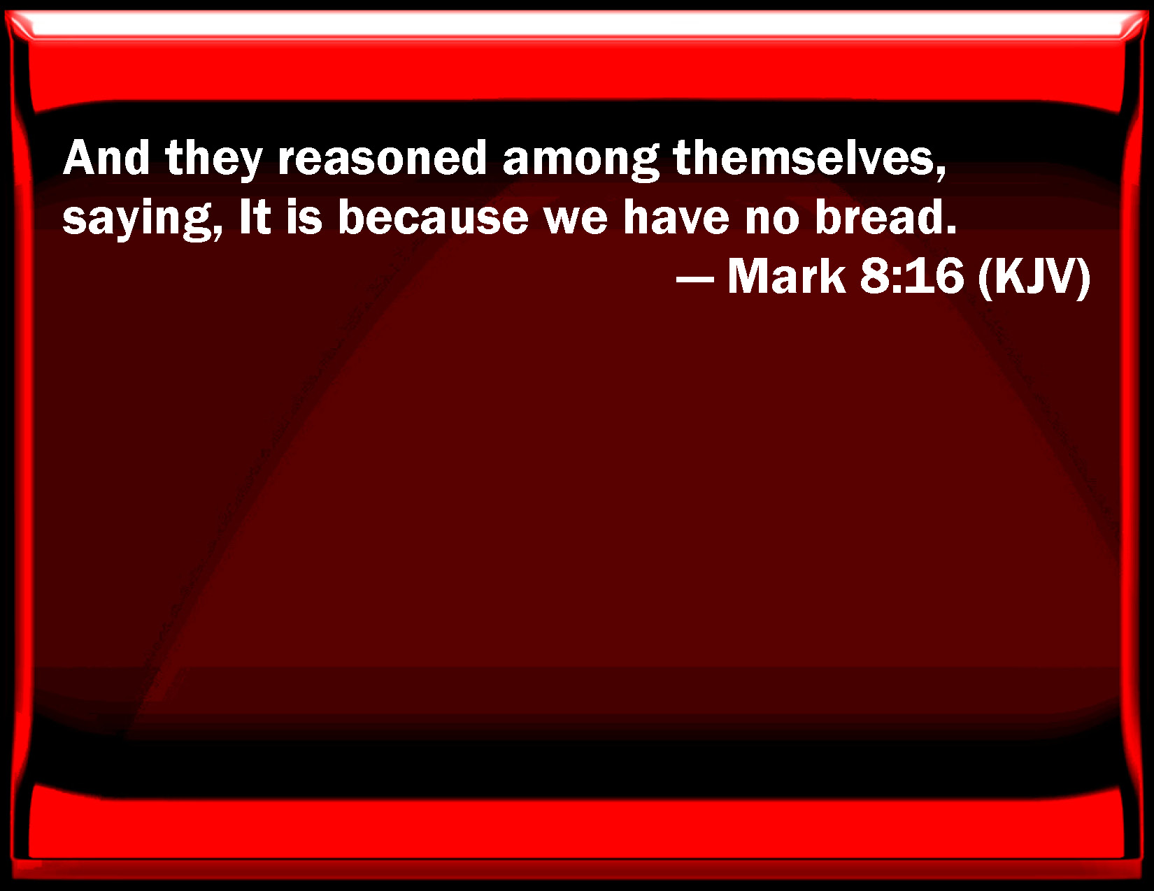 Bible Verse Slide Mark 8:16 And they reasoned among themselves, saying, It is because we have no bread. KJV: And they reasoned among themselves, saying, It is because we have no bread. DRB: And they reasoned among themselves, saying: Because we have no bread. DBT: And they reasoned with one another, saying, It is because we have no bread. ERV: And they reasoned one with another, saying, We have no bread. WBT: And they reasoned among themselves, saying, It is because we have no bread. WEB: They reasoned with one another, saying, "It's because we have no bread." YLT: and they were reasoning with one another, saying — 'Because we have no loaves.'Links Mark 8:16 NIV • Mark 8:16 NLT • Mark 8:16 ESV • Mark 8:16 NASB • Mark 8:16 KJV • Mark 8:16 Interlinear • Mark 8:16 Commentaries • Mark 8:16 Parallel Texts • Mark 8:16 Bible Apps • Mark 8:16 Parallel • Bible Hub |