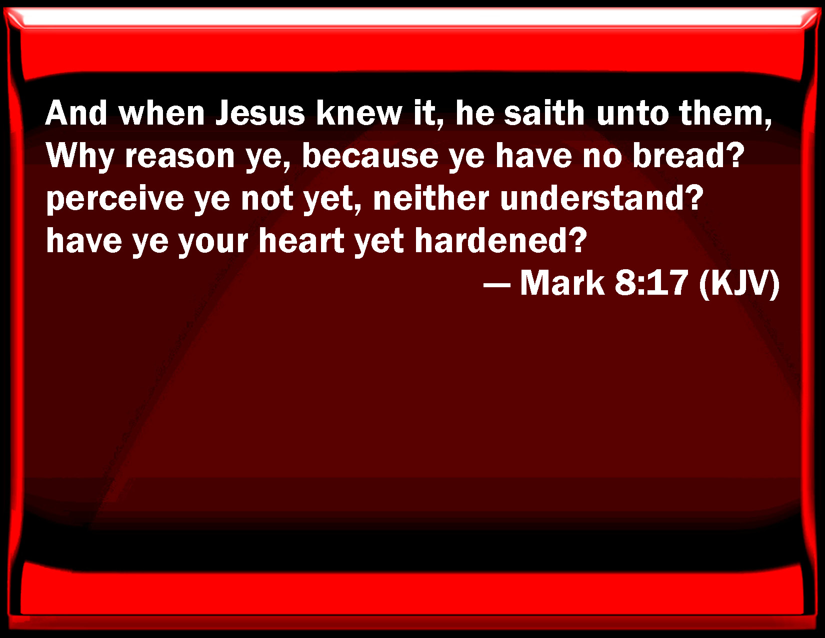 Bible Verse Slide Mark 8:17 And when Jesus knew it, he said to them, Why reason you, because you have no bread? perceive you not yet, neither understand? have you your heart yet hardened? KJV: And when Jesus knew it, he saith unto them, Why reason ye, because ye have no bread? perceive ye not yet, neither understand? have ye your heart yet hardened? DRB: Which Jesus knowing, saith to them: Why do you reason, because you have no bread? do you not yet know nor understand? have you still your heart blinded? DBT: And Jesus knowing it, says to them, Why reason ye because ye have no bread? Do ye not yet perceive nor understand? Have ye your heart yet hardened? ERV: And Jesus perceiving it saith unto them, Why reason ye, because ye have no bread? do ye not yet perceive, neither understand? have ye your heart hardened? WBT: And when Jesus knew it, he saith to them, Why reason ye, because ye have no bread? perceive ye not yet, neither understand? have ye your heart yet hardened? WEB: Jesus, perceiving it, said to them, "Why do you reason that it's because you have no bread? Don't you perceive yet, neither understand? Is your heart still hardened? YLT: And Jesus having known, saith to them, 'Why do ye reason, because ye have no loaves? do ye not yet perceive, nor understand, yet have ye your heart hardened?Links Mark 8:17 NIV • Mark 8:17 NLT • Mark 8:17 ESV • Mark 8:17 NASB • Mark 8:17 KJV • Mark 8:17 Interlinear • Mark 8:17 Commentaries • Mark 8:17 Parallel Texts • Mark 8:17 Bible Apps • Mark 8:17 Parallel • Bible Hub |