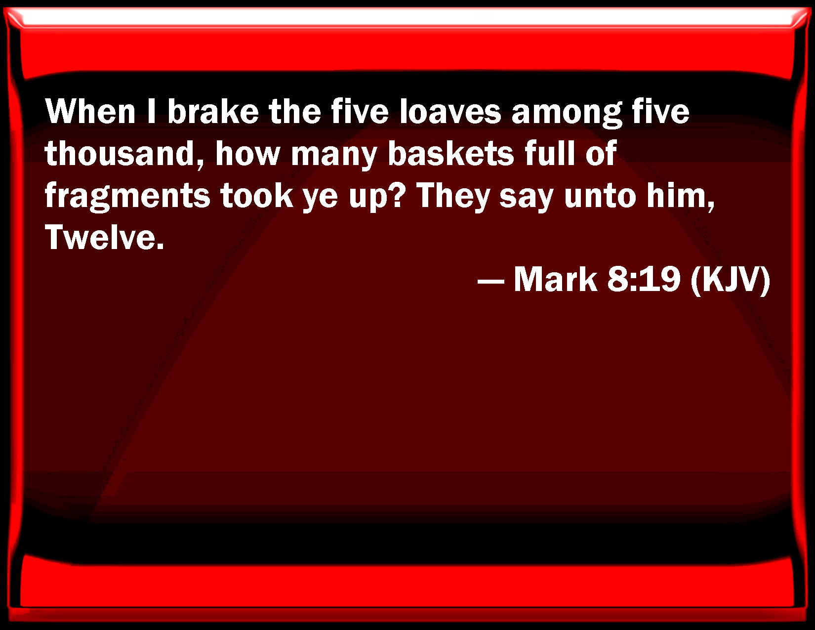 Bible Verse Slide Mark 8:19 When I broke the five loaves among five thousand, how many baskets full of fragments took you up? They say to him, Twelve. KJV: When I brake the five loaves among five thousand, how many baskets full of fragments took ye up? They say unto him, Twelve. DRB: When I broke the five loaves among five thousand, how many baskets full of fragments took you up? They say to him, Twelve. DBT: When I broke the five loaves for the five thousand, how many hand-baskets full of fragments took ye up? They say to him, Twelve. ERV: When I brake the five loaves among the five thousand, how many baskets full of broken pieces took ye up? They say unto him, Twelve. WBT: When I divided the five loaves among five thousand, how many baskets full of fragments took ye up? They say to him, Twelve. WEB: When I broke the five loaves among the five thousand, how many baskets full of broken pieces did you take up?" They told him, "Twelve." YLT: When the five loaves I did brake to the five thousand, how many hand-baskets full of broken pieces took ye up?' they say to him, 'Twelve.'Links Mark 8:19 NIV • Mark 8:19 NLT • Mark 8:19 ESV • Mark 8:19 NASB • Mark 8:19 KJV • Mark 8:19 Interlinear • Mark 8:19 Commentaries • Mark 8:19 Parallel Texts • Mark 8:19 Bible Apps • Mark 8:19 Parallel • Bible Hub |