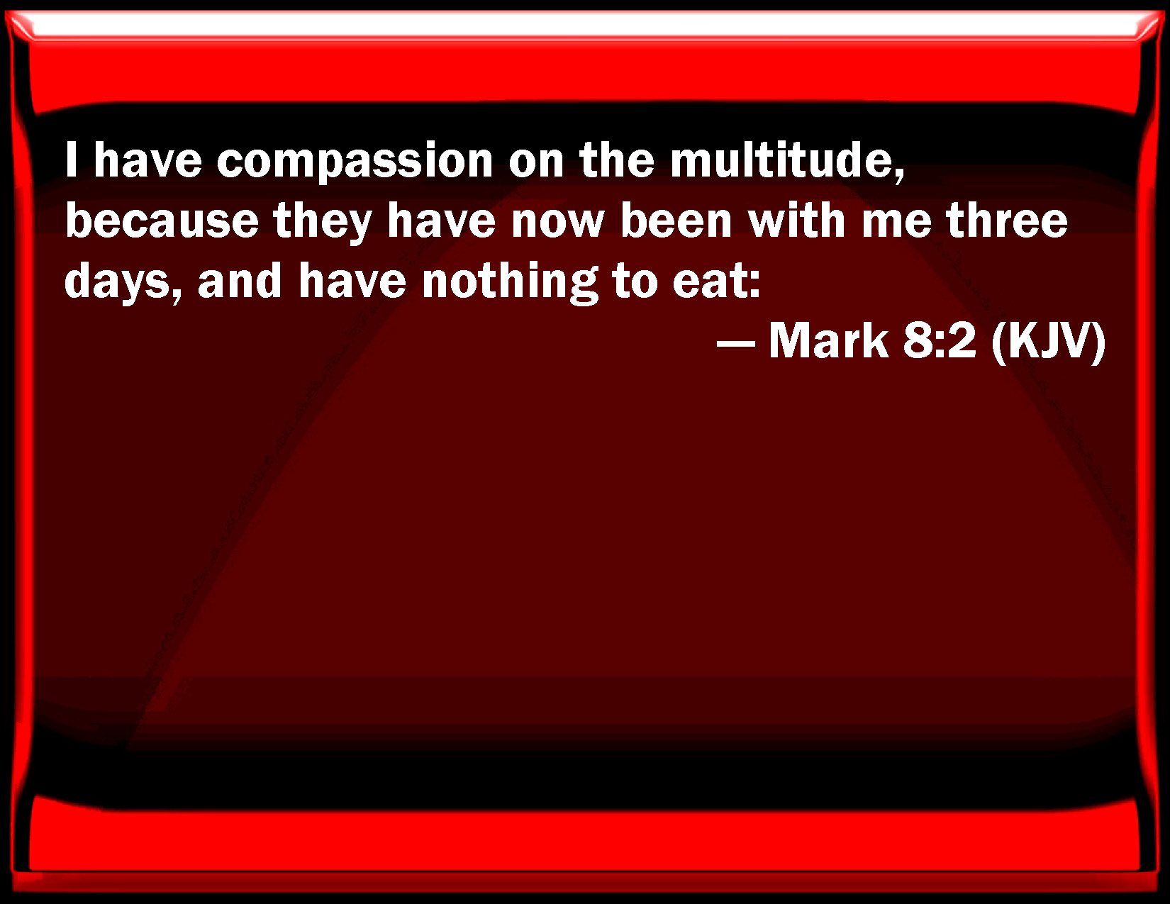 Bible Verse Slide Mark 8:2 I have compassion on the multitude, because they have now been with me three days, and have nothing to eat: KJV: I have compassion on the multitude, because they have now been with me three days, and have nothing to eat: DRB: I have compassion on the multitude, for behold they have now been with me three days, and have nothing to eat. DBT: I have compassion on the crowd, because they have stayed with me already three days and they have not anything they can eat, ERV: I have compassion on the multitude, because they continue with me now three days, and have nothing to eat: WBT: I have compassion on the multitude, because they have now been with me three days, and have nothing to eat: WEB: "I have compassion on the multitude, because they have stayed with me now three days, and have nothing to eat. YLT: 'I have compassion upon the multitude, because now three days they do continue with me, and they have not what they may eat;Links Mark 8:2 NIV • Mark 8:2 NLT • Mark 8:2 ESV • Mark 8:2 NASB • Mark 8:2 KJV • Mark 8:2 Interlinear • Mark 8:2 Commentaries • Mark 8:2 Parallel Texts • Mark 8:2 Bible Apps • Mark 8:2 Parallel • Bible Hub |