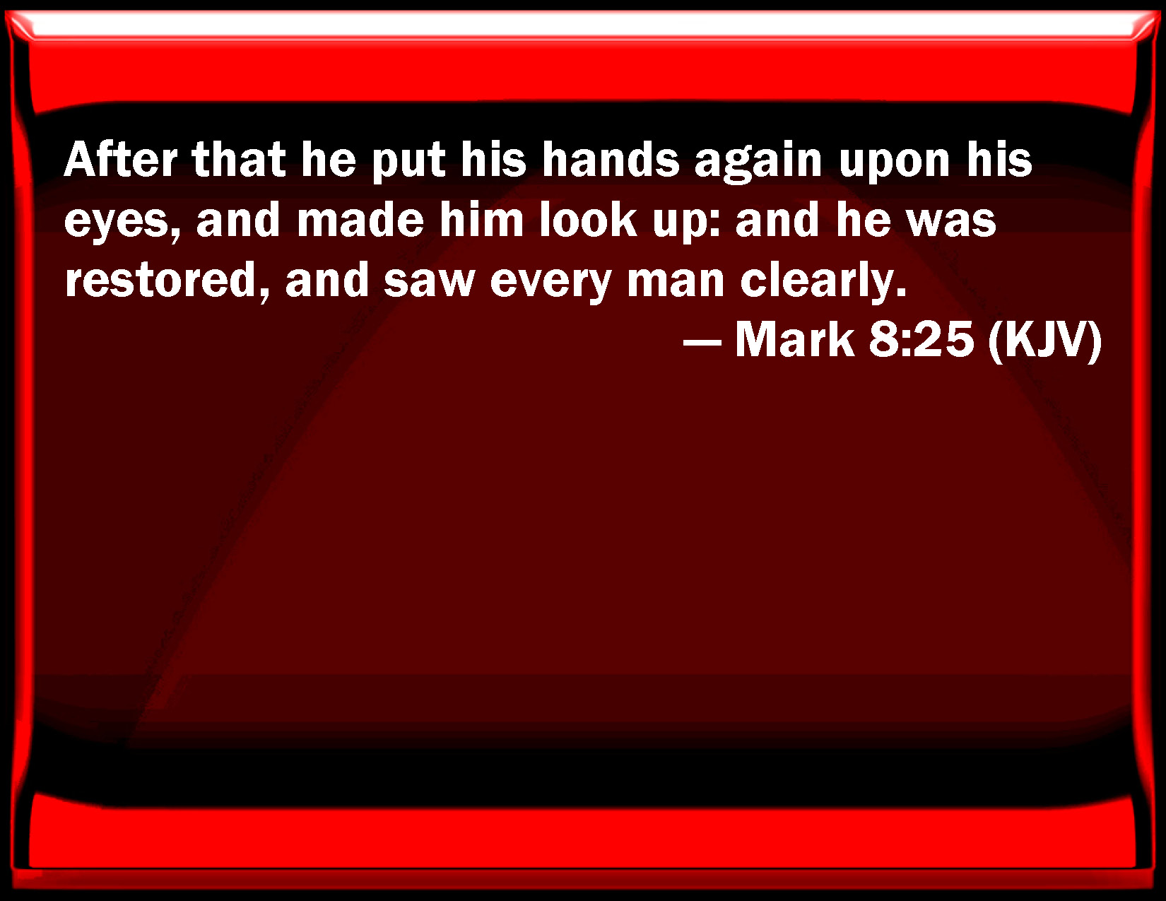 Bible Verse Slide Mark 8:25 After that he put his hands again on his eyes, and made him look up: and he was restored, and saw every man clearly. KJV: After that he put his hands again upon his eyes, and made him look up: and he was restored, and saw every man clearly. DRB: After that again he laid his hands upon his eyes, and he began to see, and was restored, so that he saw all things clearly. DBT: Then he laid his hands again upon his eyes, and he saw distinctly, and was restored and saw all things clearly. ERV: Then again he laid his hands upon his eyes; and he looked stedfastly, and was restored, and saw all things clearly. WBT: After that, he put his hands again upon his eyes, and made him look up: and he was restored, and saw every man clearly. WEB: Then again he laid his hands on his eyes. He looked intently, and was restored, and saw everyone clearly. YLT: Afterwards again he put his hands on his eyes, and made him look up, and he was restored, and discerned all things clearly,Links Mark 8:25 NIV • Mark 8:25 NLT • Mark 8:25 ESV • Mark 8:25 NASB • Mark 8:25 KJV • Mark 8:25 Interlinear • Mark 8:25 Commentaries • Mark 8:25 Parallel Texts • Mark 8:25 Bible Apps • Mark 8:25 Parallel • Bible Hub |