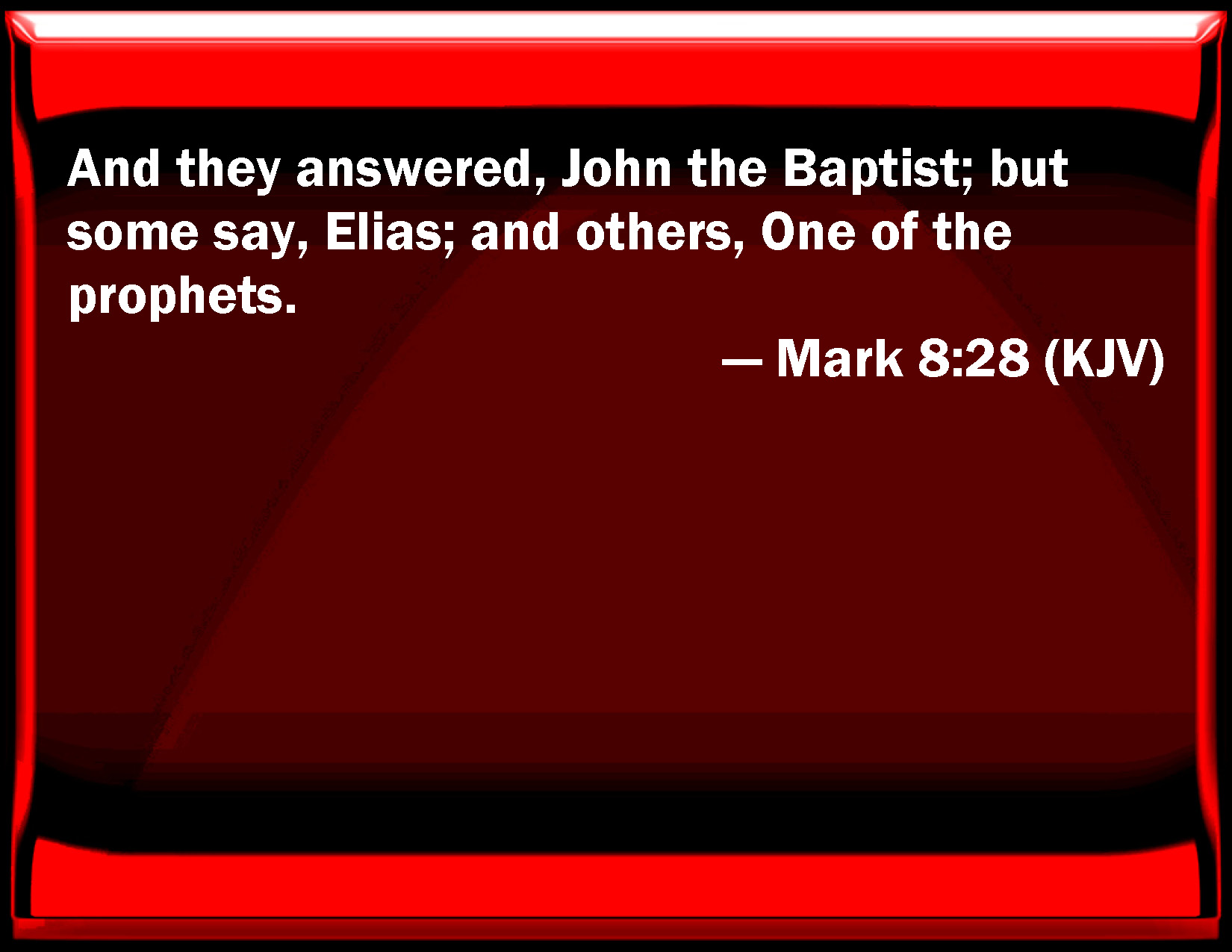 Bible Verse Slide Mark 8:28 And they answered, John the Baptist; but some say, Elias; and others, One of the prophets. KJV: And they answered, John the Baptist: but some say, Elias; and others, One of the prophets. DRB: Who answered him, saying: John the Baptist; but some Elias, and others as one of the prophets. DBT: And they answered him, saying, John the baptist; and others, Elias; but others, One of the prophets. ERV: And they told him, saying, John the Baptist: and others, Elijah; but others, One of the prophets. WBT: And they answered, John the Baptist: but some say, Elijah; and others, One of the prophets, WEB: They told him, "John the Baptizer, and others say Elijah, but others: one of the prophets." YLT: And they answered, 'John the Baptist, and others Elijah, but others one of the prophets.'Links Mark 8:28 NIV • Mark 8:28 NLT • Mark 8:28 ESV • Mark 8:28 NASB • Mark 8:28 KJV • Mark 8:28 Interlinear • Mark 8:28 Commentaries • Mark 8:28 Parallel Texts • Mark 8:28 Bible Apps • Mark 8:28 Parallel • Bible Hub |