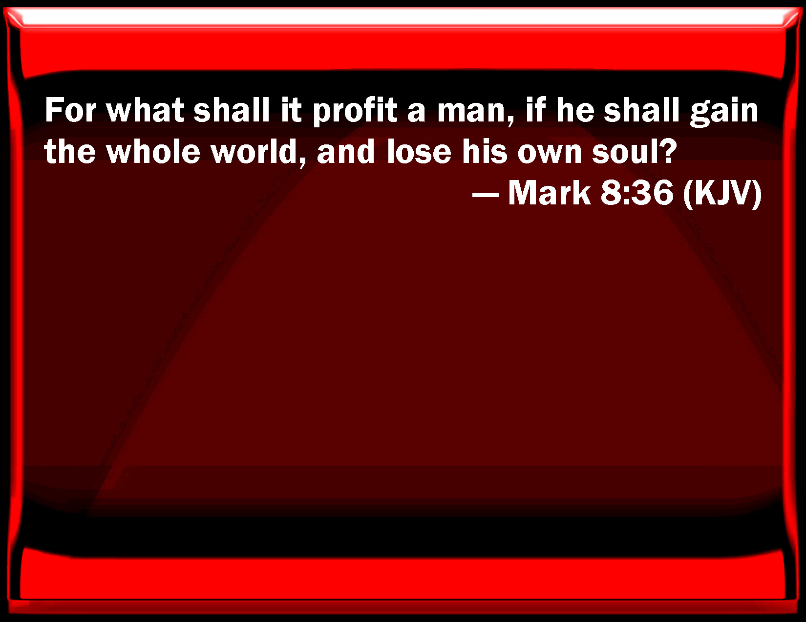 Bible Verse Slide Mark 8:36 For what shall it profit a man, if he shall gain the whole world, and lose his own soul? KJV: For what shall it profit a man, if he shall gain the whole world, and lose his own soul? DRB: For what shall it profit a man, if he gain the whole world, and suffer the loss of his soul? DBT: For what shall it profit a man if he gain the whole world and suffer the loss of his soul? ERV: For what doth it profit a man, to gain the whole world, and forfeit his life? WBT: For what shall it profit a man, if he shall gain the whole world, and lose his own soul: WEB: For what does it profit a man, to gain the whole world, and forfeit his life? YLT: for what shall it profit a man, if he may gain the whole world, and forfeit his life?Links Mark 8:36 NIV • Mark 8:36 NLT • Mark 8:36 ESV • Mark 8:36 NASB • Mark 8:36 KJV • Mark 8:36 Interlinear • Mark 8:36 Commentaries • Mark 8:36 Parallel Texts • Mark 8:36 Bible Apps • Mark 8:36 Parallel • Bible Hub |