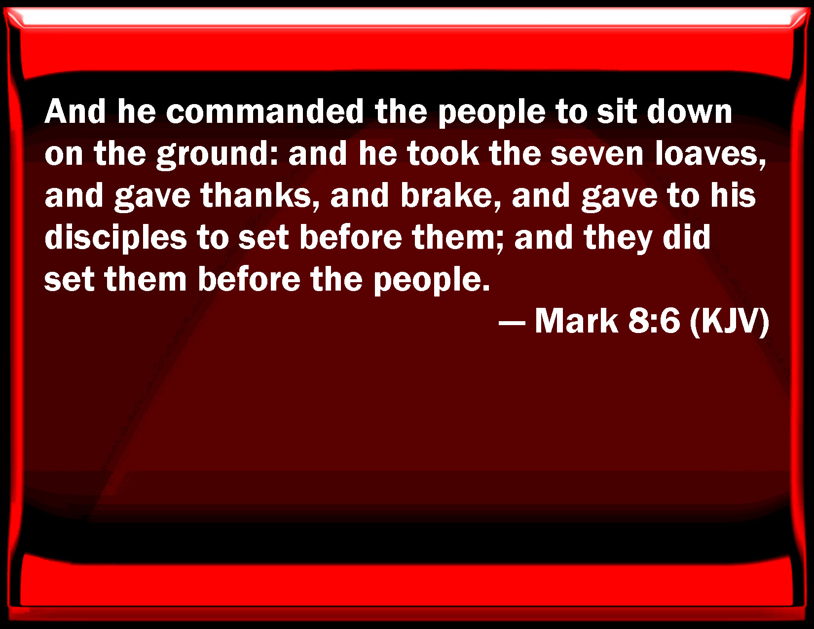Bible Verse Slide Mark 8:6 And he commanded the people to sit down on the ground: and he took the seven loaves, and gave thanks, and broke, and gave to his disciples to set before them; and they did set them before the people. KJV: And he commanded the people to sit down on the ground: and he took the seven loaves, and gave thanks, and brake, and gave to his disciples to set before them; and they did set them before the people. DRB: And taking the seven loaves, giving thanks, he broke, and gave to his disciples for to set before them; and they set them before the people. DBT: And he commanded the crowd to sit down on the ground. And having taken the seven loaves, he gave thanks, and broke them and gave them to his disciples, that they might set them before them; and they set them before the crowd. ERV: And he commandeth the multitude to sit down on the ground: and he took the seven loaves, and having given thanks, he brake, and gave to his disciples, to set before them; and they set them before the multitude. WBT: And he commanded the people to sit down on the ground: and he took the seven loaves, and gave thanks, and broke, and gave to his disciples to set before them; and they set them before the people. WEB: He commanded the multitude to sit down on the ground, and he took the seven loaves. Having given thanks, he broke them, and gave them to his disciples to serve, and they served the multitude. YLT: And he commanded the multitude to sit down upon the ground, and having taken the seven loaves, having given thanks, he brake, and was giving to his disciples that they may set before them; and they did set before the multitude.Links Mark 8:6 NIV • Mark 8:6 NLT • Mark 8:6 ESV • Mark 8:6 NASB • Mark 8:6 KJV • Mark 8:6 Interlinear • Mark 8:6 Commentaries • Mark 8:6 Parallel Texts • Mark 8:6 Bible Apps • Mark 8:6 Parallel • Bible Hub |