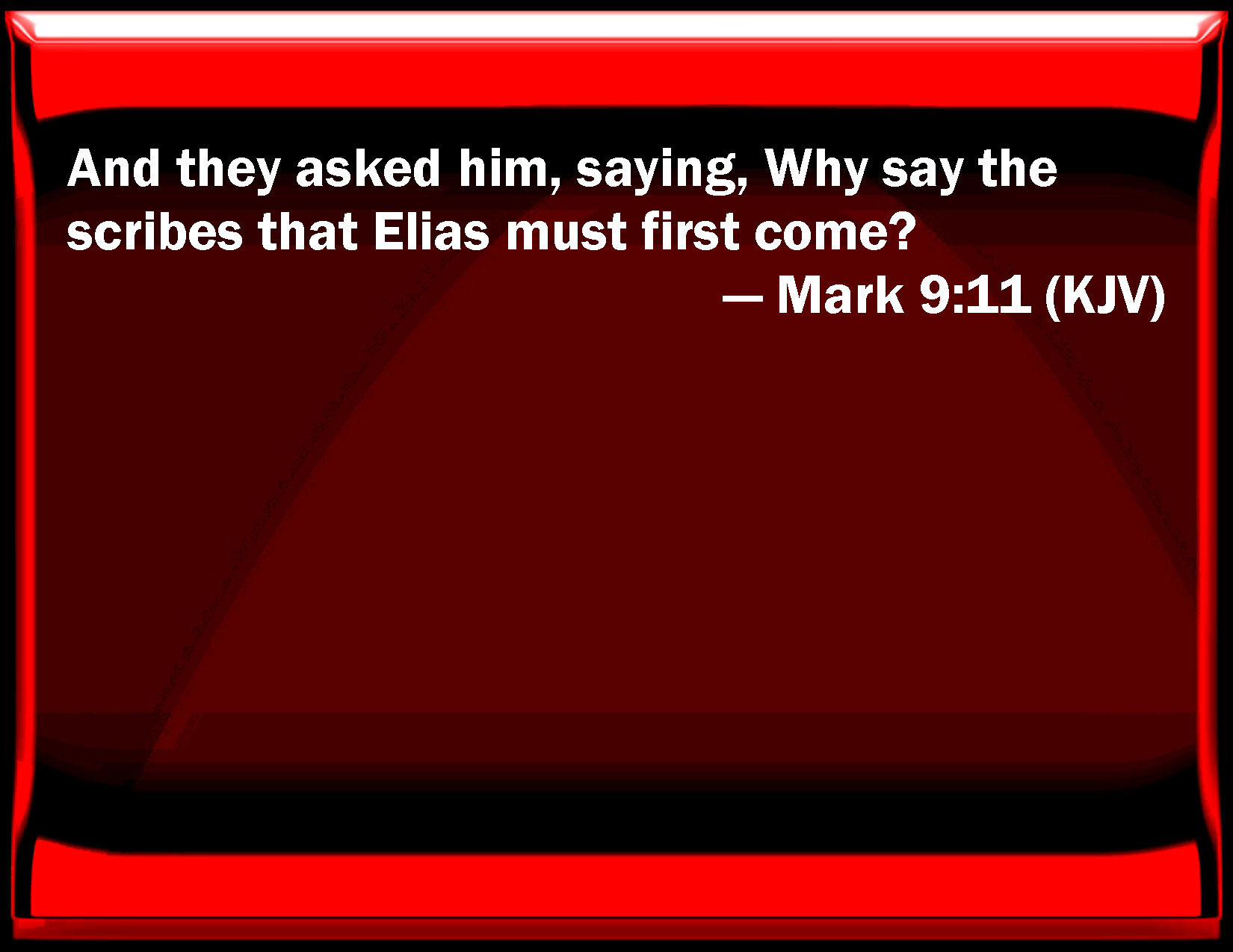Bible Verse Slide Mark 9:11 And they asked him, saying, Why say the scribes that Elias must first come? KJV: And they asked him, saying, Why say the scribes that Elias must first come? DRB: And they asked him, saying: Why then do the Pharisees and scribes say that Elias must come first? DBT: And they asked him saying, Why do the scribes say that Elias must first have come? ERV: And they asked him, saying, The scribes say that Elijah must first come. WBT: And they asked him, saying, Why say the scribes that Elijah must first come? WEB: They asked him, saying, "Why do the scribes say that Elijah must come first?" YLT: And they were questioning him, saying, that the scribes say that Elijah it behoveth to come first.Links Mark 9:11 NIV • Mark 9:11 NLT • Mark 9:11 ESV • Mark 9:11 NASB • Mark 9:11 KJV • Mark 9:11 Interlinear • Mark 9:11 Commentaries • Mark 9:11 Parallel Texts • Mark 9:11 Bible Apps • Mark 9:11 Parallel • Bible Hub |