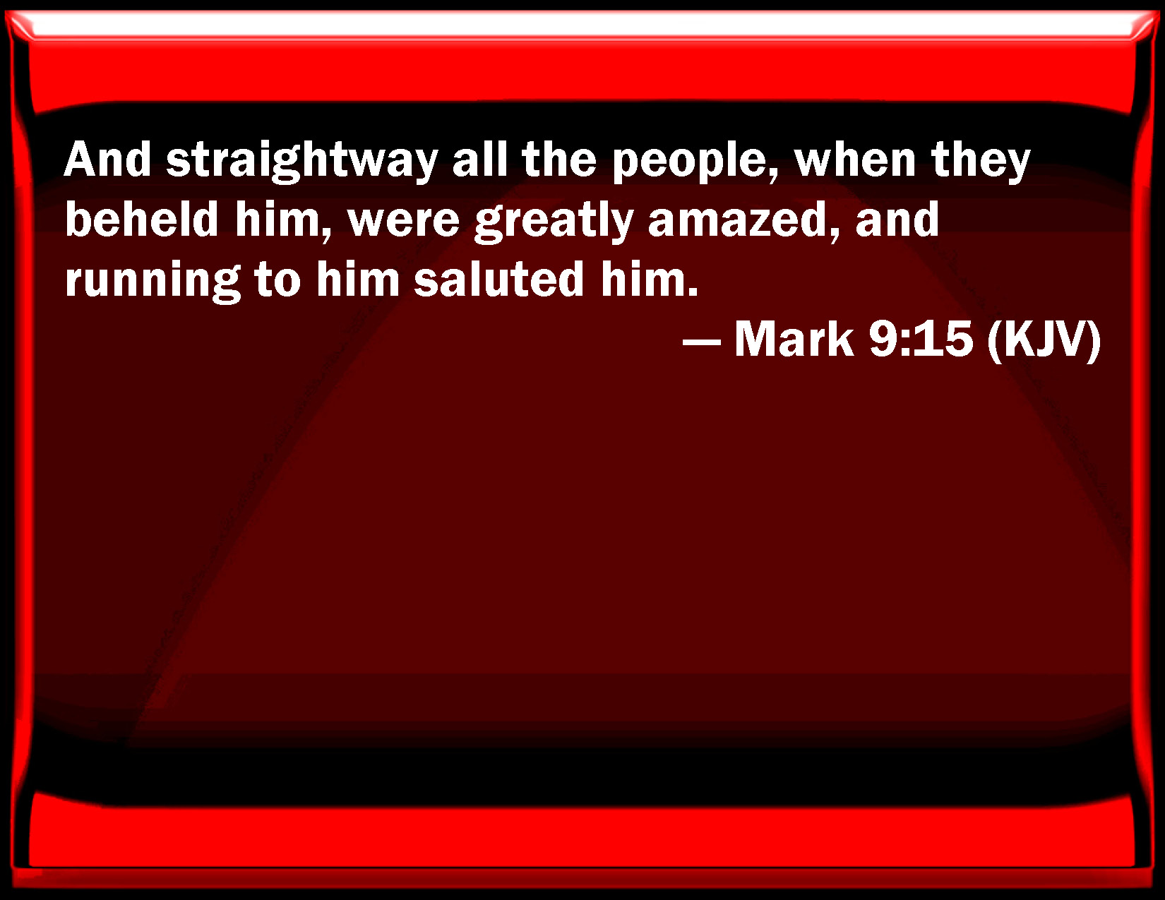 Bible Verse Slide Mark 9:15 And straightway all the people, when they beheld him, were greatly amazed, and running to him saluted him. KJV: And straightway all the people, when they beheld him, were greatly amazed, and running to him saluted him. DRB: And presently all the people seeing Jesus, were astonished and struck with fear; and running to him, they saluted him. DBT: And immediately all the crowd seeing him were amazed, and running to him, saluted him. ERV: And straightway all the multitude, when they saw him, were greatly amazed, and running to him saluted him. WBT: And immediately all the people, when they beheld him, were greatly amazed, and running to him, saluted him. WEB: Immediately all the multitude, when they saw him, were greatly amazed, and running to him greeted him. YLT: and immediately, all the multitude having seen him, were amazed, and running near, were saluting him.Links Mark 9:15 NIV • Mark 9:15 NLT • Mark 9:15 ESV • Mark 9:15 NASB • Mark 9:15 KJV • Mark 9:15 Interlinear • Mark 9:15 Commentaries • Mark 9:15 Parallel Texts • Mark 9:15 Bible Apps • Mark 9:15 Parallel • Bible Hub |