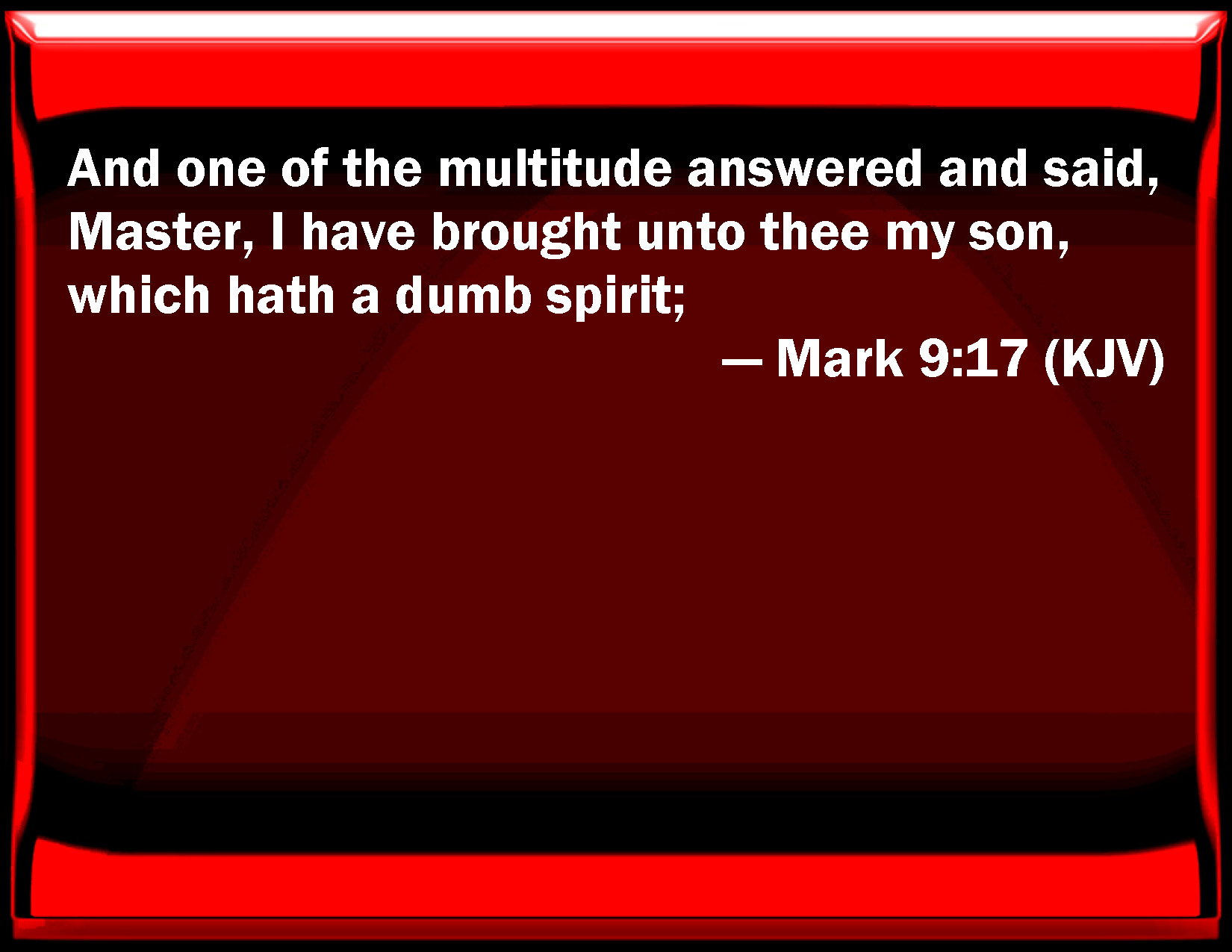 Bible Verse Slide Mark 9:17 And one of the multitude answered and said, Master, I have brought to you my son, which has a dumb spirit; KJV: And one of the multitude answered and said, Master, I have brought unto thee my son, which hath a dumb spirit; DRB: And one of the multitude, answering, said: Master, I have brought my son to thee, having a dumb spirit. DBT: And one out of the crowd answered him, Teacher, I brought to thee my son, who has a dumb spirit; ERV: And one of the multitude answered him, Master, I brought unto thee my son, which hath a dumb spirit; WBT: And one of the multitude answered and said, Master, I have brought to thee my son, who hath a dumb spirit; WEB: One of the multitude answered, "Teacher, I brought to you my son, who has a mute spirit; YLT: and one out of the multitude answering said, 'Teacher, I brought my son unto thee, having a dumb spirit;Links Mark 9:17 NIV • Mark 9:17 NLT • Mark 9:17 ESV • Mark 9:17 NASB • Mark 9:17 KJV • Mark 9:17 Interlinear • Mark 9:17 Commentaries • Mark 9:17 Parallel Texts • Mark 9:17 Bible Apps • Mark 9:17 Parallel • Bible Hub |