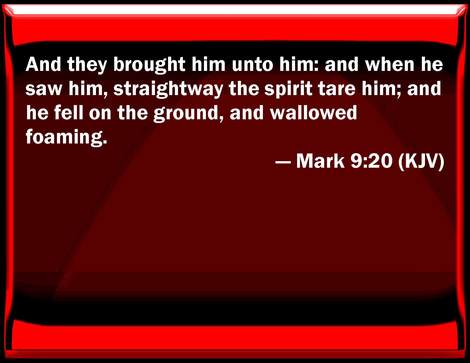 Bible Verse Slide Mark 9:20 And they brought him to him: and when he saw him, straightway the spirit tare him; and he fell on the ground, and wallowed foaming. KJV: And they brought him unto him: and when he saw him, straightway the spirit tare him; and he fell on the ground, and wallowed foaming. DRB: And they brought him. And when he had seen him, immediately the spirit troubled him; and being thrown down upon the ground, he rolled about foaming. DBT: And they brought him to him. And seeing him the spirit immediately tore him; and falling upon the earth he rolled foaming. ERV: And they brought him unto him: and when he saw him, straightway the spirit tare him grievously; and he fell on the ground, and wallowed foaming. WBT: And they brought him to him: and when he saw him, immediately the spirit tore him; and he fell on the ground, and wallowed, foaming. WEB: They brought him to him, and when he saw him, immediately the spirit convulsed him, and he fell on the ground, wallowing and foaming at the mouth. YLT: and they brought him unto him, and he having seen him, immediately the spirit tare him, and he, having fallen upon the earth, was wallowing — foaming.Links Mark 9:20 NIV • Mark 9:20 NLT • Mark 9:20 ESV • Mark 9:20 NASB • Mark 9:20 KJV • Mark 9:20 Interlinear • Mark 9:20 Commentaries • Mark 9:20 Parallel Texts • Mark 9:20 Bible Apps • Mark 9:20 Parallel • Bible Hub |