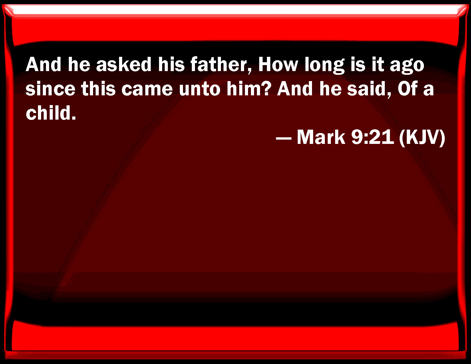 Bible Verse Slide Mark 9:21 And he asked his father, How long is it ago since this came to him? And he said, Of a child. KJV: And he asked his father, How long is it ago since this came unto him? And he said, Of a child. DRB: And he asked his father: How long time is it since this hath happened unto him? But he said: From his infancy: DBT: And he asked his father, How long a time is it that it has been like this with him? And he said, From childhood; ERV: And he asked his father, How long time is it since this hath come unto him? And he said, From a child. WBT: And he asked his father, How long is it since this came to him? and he said, From a child. WEB: He asked his father, "How long has it been since this has come to him?" He said, "From childhood. YLT: And he questioned his father, 'How long time is it since this came to him?' and he said, 'From childhood,Links Mark 9:21 NIV • Mark 9:21 NLT • Mark 9:21 ESV • Mark 9:21 NASB • Mark 9:21 KJV • Mark 9:21 Interlinear • Mark 9:21 Commentaries • Mark 9:21 Parallel Texts • Mark 9:21 Bible Apps • Mark 9:21 Parallel • Bible Hub |