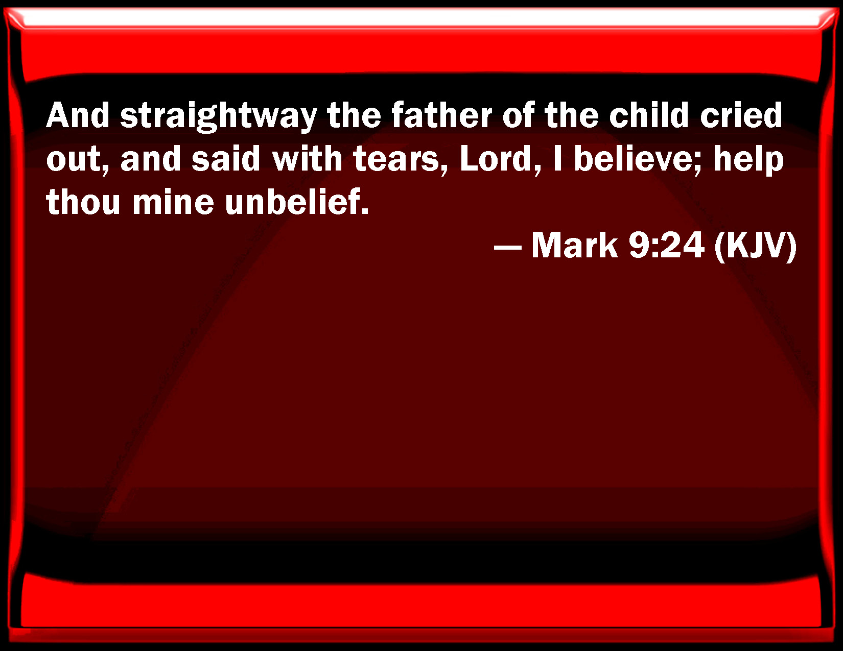 Bible Verse Slide Mark 9:24 And straightway the father of the child cried out, and said with tears, Lord, I believe; help you my unbelief. KJV: And straightway the father of the child cried out, and said with tears, Lord, I believe; help thou mine unbelief. DRB: And immediately the father of the boy crying out, with tears said: I do believe, Lord: help my unbelief. DBT: And immediately the father of the young child crying out said with tears, I believe, help mine unbelief. ERV: Straightway the father of the child cried out, and said, I believe; help thou mine unbelief. WBT: And immediately the father of the child cried out, and said with tears, Lord, I believe; help thou my unbelief. WEB: Immediately the father of the child cried out with tears, "I believe. Help my unbelief!" YLT: and immediately the father of the child, having cried out, with tears said, 'I believe, sir; be helping mine unbelief.'Links Mark 9:24 NIV • Mark 9:24 NLT • Mark 9:24 ESV • Mark 9:24 NASB • Mark 9:24 KJV • Mark 9:24 Interlinear • Mark 9:24 Commentaries • Mark 9:24 Parallel Texts • Mark 9:24 Bible Apps • Mark 9:24 Parallel • Bible Hub |