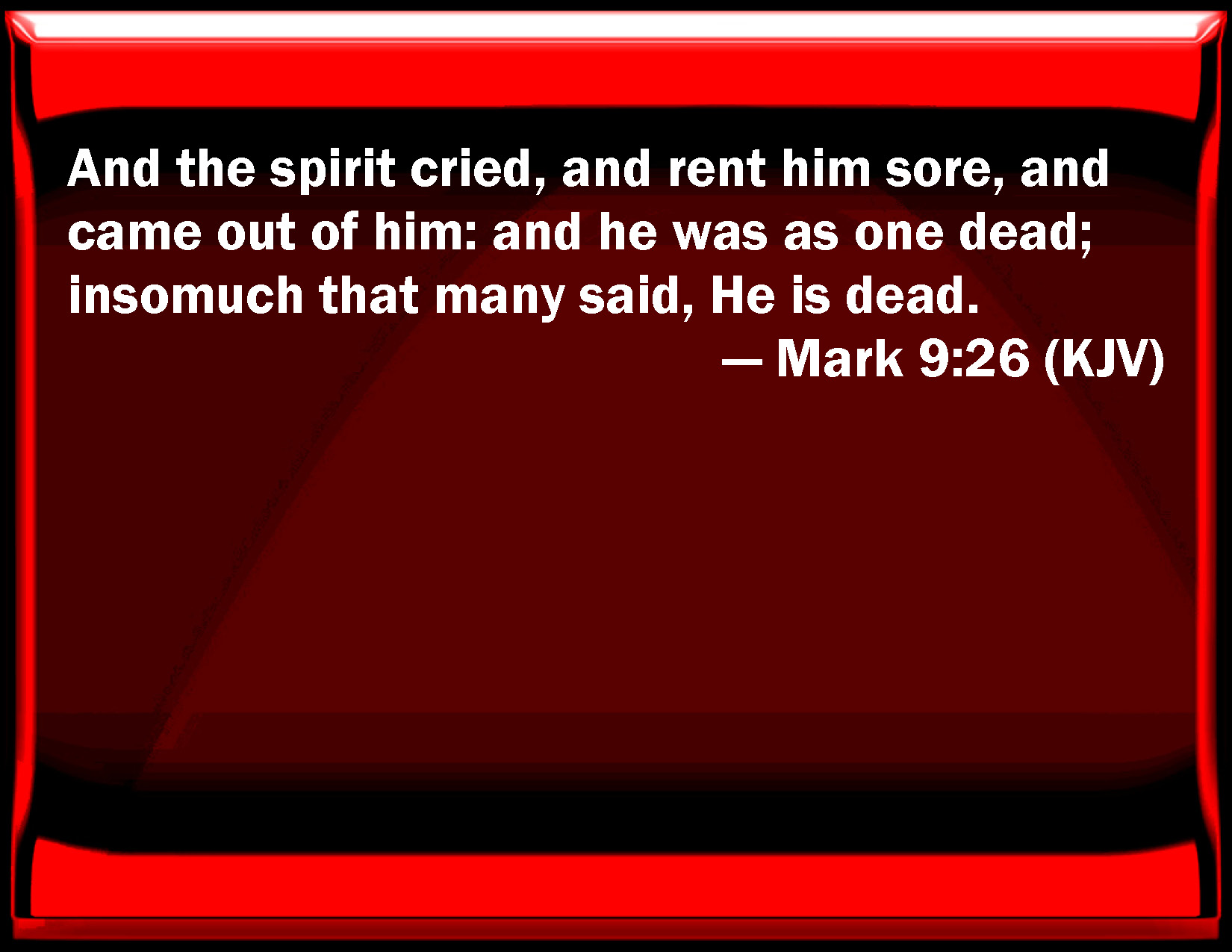 Bible Verse Slide Mark 9:26 And the spirit cried, and rent him sore, and came out of him: and he was as one dead; so that many said, He is dead. KJV: And the spirit cried, and rent him sore, and came out of him: and he was as one dead; insomuch that many said, He is dead. DRB: And crying out, and greatly tearing him, he went out of him, and he became as dead, so that many said: He is dead. DBT: And having cried out and torn him much, he came out; and he became as if dead, so that the most said, He is dead. ERV: And having cried out, and torn him much, he came out: and the child became as one dead; insomuch that the more part said, He is dead. WBT: And the spirit cried, and rent him severely, and came out of him: and he was as one dead; so that many said, He is dead. WEB: Having cried out, and convulsed greatly, it came out of him. The boy became like one dead; so much that most of them said, "He is dead." YLT: and having cried, and rent him much, it came forth, and he became as dead, so that many said that he was dead,Links Mark 9:26 NIV • Mark 9:26 NLT • Mark 9:26 ESV • Mark 9:26 NASB • Mark 9:26 KJV • Mark 9:26 Interlinear • Mark 9:26 Commentaries • Mark 9:26 Parallel Texts • Mark 9:26 Bible Apps • Mark 9:26 Parallel • Bible Hub |