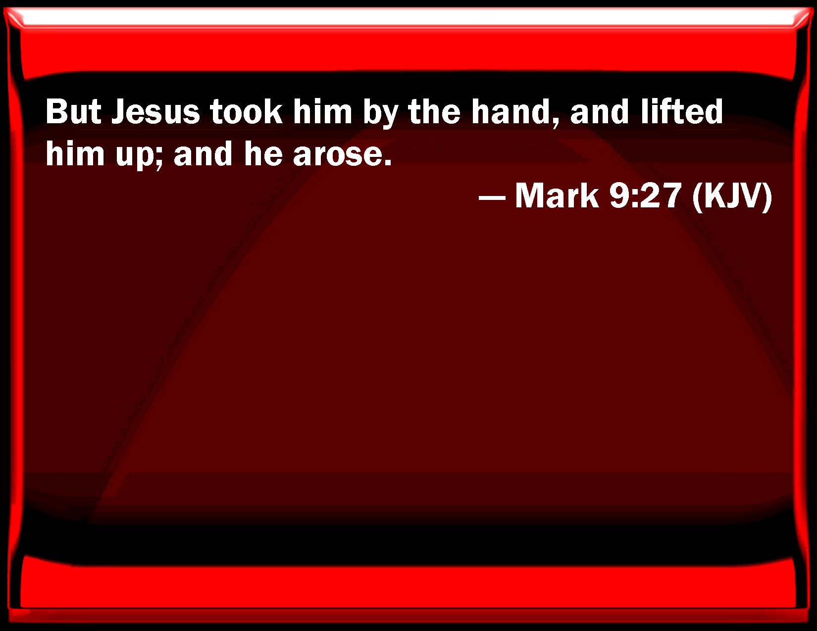 Bible Verse Slide Mark 9:27 But Jesus took him by the hand, and lifted him up; and he arose. KJV: But Jesus took him by the hand, and lifted him up; and he arose. DRB: But Jesus taking him by the hand, lifted him up; and he arose. DBT: But Jesus, having taken hold of him by the hand, lifted him up, and he arose. ERV: But Jesus took him by the hand, and raised him up; and he arose. WBT: But Jesus took him by the hand, and lifted him up; and he arose. WEB: But Jesus took him by the hand, and raised him up; and he arose. YLT: but Jesus, having taken him by the hand, lifted him up, and he arose.Links Mark 9:27 NIV • Mark 9:27 NLT • Mark 9:27 ESV • Mark 9:27 NASB • Mark 9:27 KJV • Mark 9:27 Interlinear • Mark 9:27 Commentaries • Mark 9:27 Parallel Texts • Mark 9:27 Bible Apps • Mark 9:27 Parallel • Bible Hub |