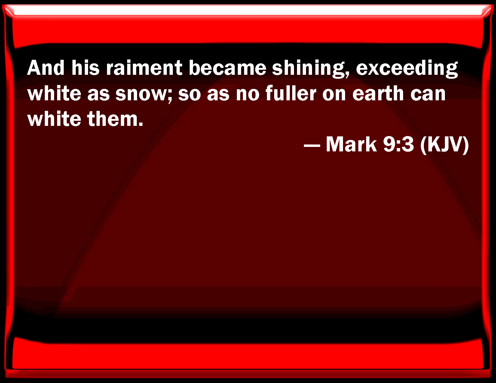 Bible Verse Slide Mark 9:3 And his raiment became shining, exceeding white as snow; so as no fuller on earth can white them. KJV: And his raiment became shining, exceeding white as snow; so as no fuller on earth can white them. DRB: And his garments became shining and exceeding white as snow, so as no fuller upon earth can make white. DBT: and his garments became shining, exceeding white as snow, such as fuller on earth could not whiten them. ERV: and his garments became glistering, exceeding white; so as no fuller on earth can whiten them. WBT: And his raiment became shining, exceeding white as snow; so as no fuller on earth can whiten them. WEB: His clothing became glistening, exceedingly white, like snow, such as no launderer on earth can whiten them. YLT: and his garments became glittering, white exceedingly, as snow, so as a fuller upon the earth is not able to whiten them.Links Mark 9:3 NIV • Mark 9:3 NLT • Mark 9:3 ESV • Mark 9:3 NASB • Mark 9:3 KJV • Mark 9:3 Interlinear • Mark 9:3 Commentaries • Mark 9:3 Parallel Texts • Mark 9:3 Bible Apps • Mark 9:3 Parallel • Bible Hub |