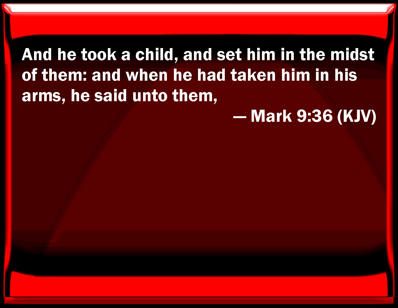 Bible Verse Slide Mark 9:36 And he took a child, and set him in the middle of them: and when he had taken him in his arms, he said to them, KJV: And he took a child, and set him in the midst of them: and when he had taken him in his arms, he said unto them, DRB: And taking a child, he set him in the midst of them. Whom when he had embraced, he saith to them: DBT: And taking a little child he set it in their midst, and having taken it in his arms he said to them, ERV: And he took a little child, and set him in the midst of them: and taking him in his arms, he said unto them, WBT: And he took a child, and set him in the midst of them: and when he had taken him in his arms, he said to them, WEB: He took a little child, and set him in the midst of them. Taking him in his arms, he said to them, YLT: And having taken a child, he set him in the midst of them, and having taken him in his arms, said to them,Links Mark 9:36 NIV • Mark 9:36 NLT • Mark 9:36 ESV • Mark 9:36 NASB • Mark 9:36 KJV • Mark 9:36 Interlinear • Mark 9:36 Commentaries • Mark 9:36 Parallel Texts • Mark 9:36 Bible Apps • Mark 9:36 Parallel • Bible Hub |