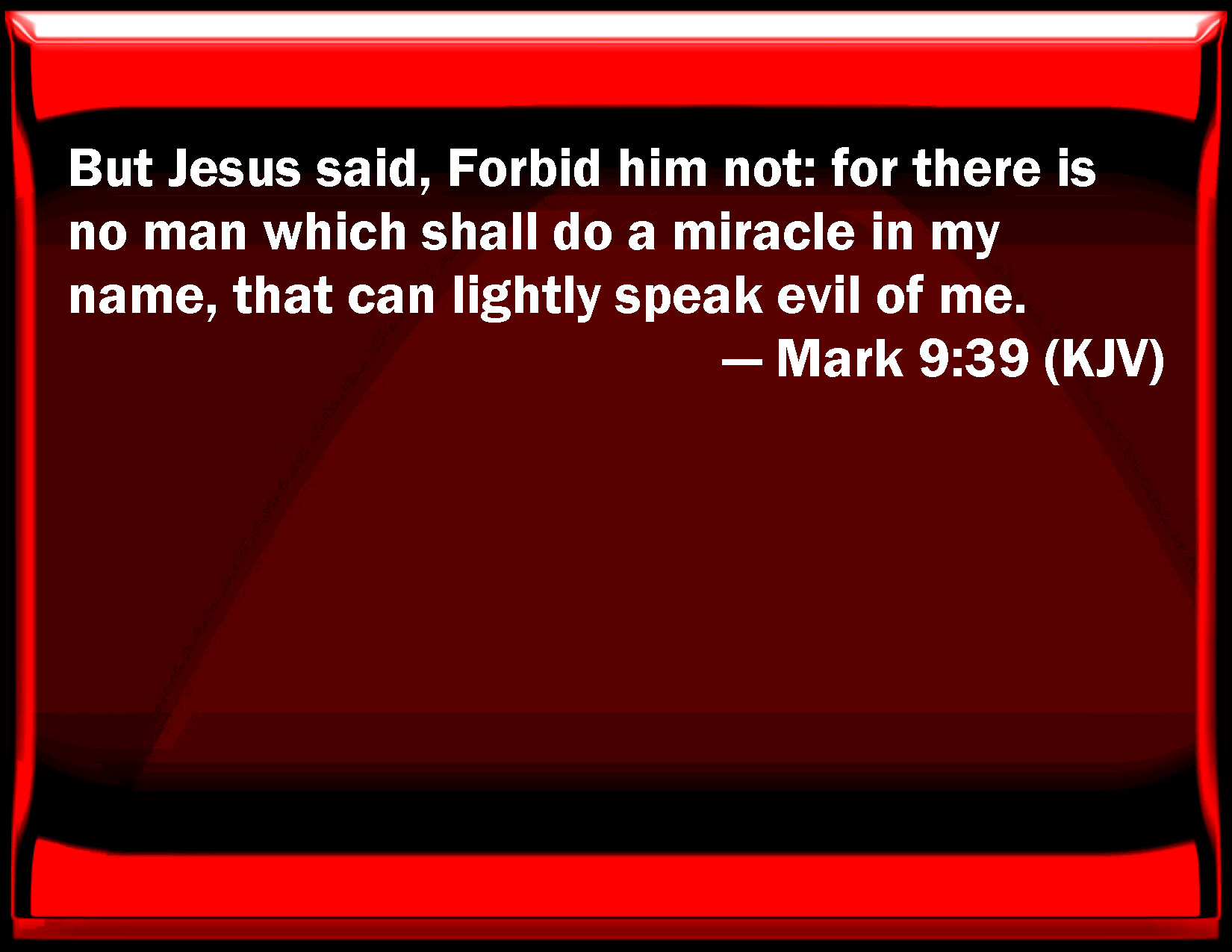 Bible Verse Slide Mark 9:39 But Jesus said, Forbid him not: for there is no man which shall do a miracle in my name, that can lightly speak evil of me. KJV: But Jesus said, Forbid him not: for there is no man which shall do a miracle in my name, that can lightly speak evil of me. DRB: But Jesus said: Do not forbid him. For there is no man that doth a miracle in my name, and can soon speak ill of me. DBT: But Jesus said, Forbid him not; for there is no one who shall do a miracle in my name, and be able soon after to speak ill of me; ERV: But Jesus said, Forbid him not: for there is no man which shall do a mighty work in my name, and be able quickly to speak evil of me. WBT: But Jesus said, Forbid him not; for there is no man who shall do a miracle in my name, that can lightly speak evil of me. WEB: But Jesus said, "Don't forbid him, for there is no one who will do a mighty work in my name, and be able quickly to speak evil of me. YLT: And Jesus said, 'Forbid him not, for there is no one who shall do a mighty work in my name, and shall be able readily to speak evil of me:Links Mark 9:39 NIV • Mark 9:39 NLT • Mark 9:39 ESV • Mark 9:39 NASB • Mark 9:39 KJV • Mark 9:39 Interlinear • Mark 9:39 Commentaries • Mark 9:39 Parallel Texts • Mark 9:39 Bible Apps • Mark 9:39 Parallel • Bible Hub |