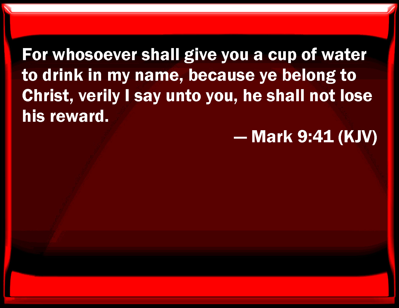 Bible Verse Slide Mark 9:41 For whoever shall give you a cup of water to drink in my name, because you belong to Christ, truly I say to you, he shall not lose his reward. KJV: For whosoever shall give you a cup of water to drink in my name, because ye belong to Christ, verily I say unto you, he shall not lose his reward. DRB: For whosoever shall give you to drink a cup of water in my name, because you belong to Christ: amen I say to you, he shall not lose his reward. DBT: For whosoever shall give you a cup of water to drink in my name, because ye are Christ's, verily I say unto you, he shall in no wise lose his reward. ERV: For whosoever shall give you a cup of water to drink, because ye are Christ's, verily I say unto you, he shall in no wise lose his reward. WBT: For whoever shall give you a cup of water to drink in my name, because ye belong to Christ, verily I say to you, he shall not lose his reward. WEB: For whoever will give you a cup of water to drink in my name, because you are Christ's, most certainly I tell you, he will in no way lose his reward. YLT: for whoever may give you to drink a cup of water in my name, because ye are Christ's, verily I say to you, he may not lose his reward;Links Mark 9:41 NIV • Mark 9:41 NLT • Mark 9:41 ESV • Mark 9:41 NASB • Mark 9:41 KJV • Mark 9:41 Interlinear • Mark 9:41 Commentaries • Mark 9:41 Parallel Texts • Mark 9:41 Bible Apps • Mark 9:41 Parallel • Bible Hub |