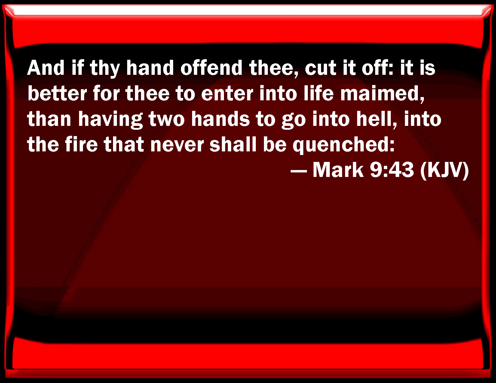 Bible Verse Slide Mark 9:43 And if your hand offend you, cut it off: it is better for you to enter into life maimed, than having two hands to go into hell, into the fire that never shall be quenched: KJV: And if thy hand offend thee, cut it off: it is better for thee to enter into life maimed, than having two hands to go into hell, into the fire that never shall be quenched: DRB: And if thy hand scandalize thee, cut it off: it is better for thee to enter into life, maimed, than having two hands to go into hell, into unquenchable fire: DBT: And if thy hand serve as a snare to thee, cut it off: it is better for thee to enter into life maimed, than having thy two hands to go away into hell, into the fire unquenchable; ERV: And if thy hand cause thee to stumble, cut it off: it is good for thee to enter into life maimed, rather than having thy two hands to go into hell, into the unquenchable fire. WBT: And if thy hand causeth thee to fall into sin, cut it off: it is better for thee to enter life maimed, than having two hands to go into hell, into the fire that never shall be quenched: WEB: If your hand causes you to stumble, cut it off. It is better for you to enter into life maimed, rather than having your two hands to go into Gehenna, into the unquenchable fire, YLT: And if thy hand may cause thee to stumble, cut it off; it is better for thee maimed to enter into the life, than having the two hands, to go away to the gehenna, to the fire — the unquenchable — Links Mark 9:43 NIV • Mark 9:43 NLT • Mark 9:43 ESV • Mark 9:43 NASB • Mark 9:43 KJV • Mark 9:43 Interlinear • Mark 9:43 Commentaries • Mark 9:43 Parallel Texts • Mark 9:43 Bible Apps • Mark 9:43 Parallel • Bible Hub |
