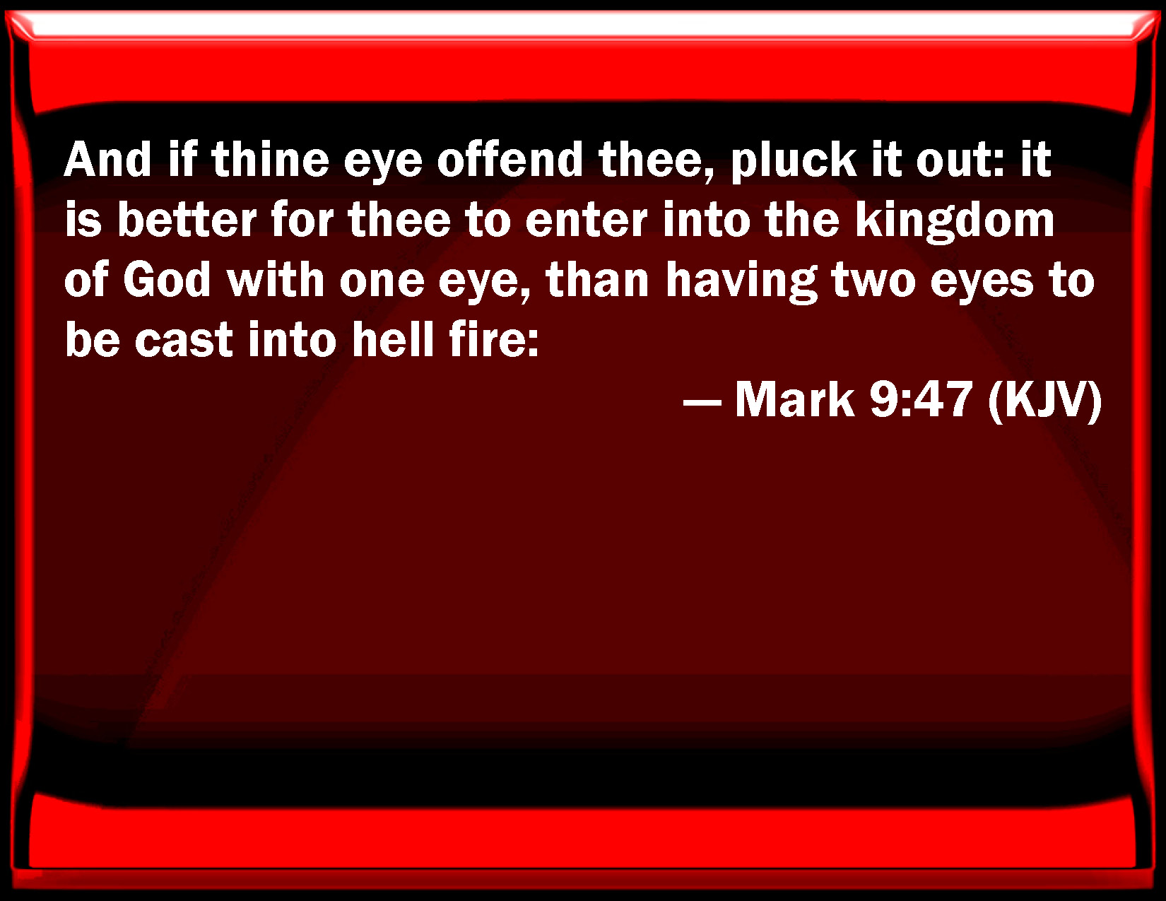 Bible Verse Slide Mark 9:47 And if your eye offend you, pluck it out: it is better for you to enter into the kingdom of God with one eye, than having two eyes to be cast into hell fire: KJV: And if thine eye offend thee, pluck it out: it is better for thee to enter into the kingdom of God with one eye, than having two eyes to be cast into hell fire: DRB: And if thy eye scandalize thee, pluck it out. It is better for thee with one eye to enter into the kingdom of God, than having two eyes to be cast into the hell of fire: DBT: And if thine eye serve as a snare to thee, cast it out: it is better for thee to enter into the kingdom of God with one eye, rather than having two eyes to be cast into the hell of fire, ERV: And if thine eye cause thee to stumble, cast it out: it is good for thee to enter into the kingdom of God with one eye, rather than having two eyes to be cast into hell; WBT: And if thy eye causeth thee to fall into sin, pluck it out: it is better for thee to enter into the kingdom of God with one eye, than having two eyes, to be cast into hell-fire. WEB: If your eye causes you to stumble, cast it out. It is better for you to enter into the Kingdom of God with one eye, rather than having two eyes to be cast into the Gehenna of fire, YLT: And if thine eye may cause thee to stumble, cast it out; it is better for thee one-eyed to enter into the reign of God, than having two eyes, to be cast to the gehenna of the fire — Links Mark 9:47 NIV • Mark 9:47 NLT • Mark 9:47 ESV • Mark 9:47 NASB • Mark 9:47 KJV • Mark 9:47 Interlinear • Mark 9:47 Commentaries • Mark 9:47 Parallel Texts • Mark 9:47 Bible Apps • Mark 9:47 Parallel • Bible Hub |