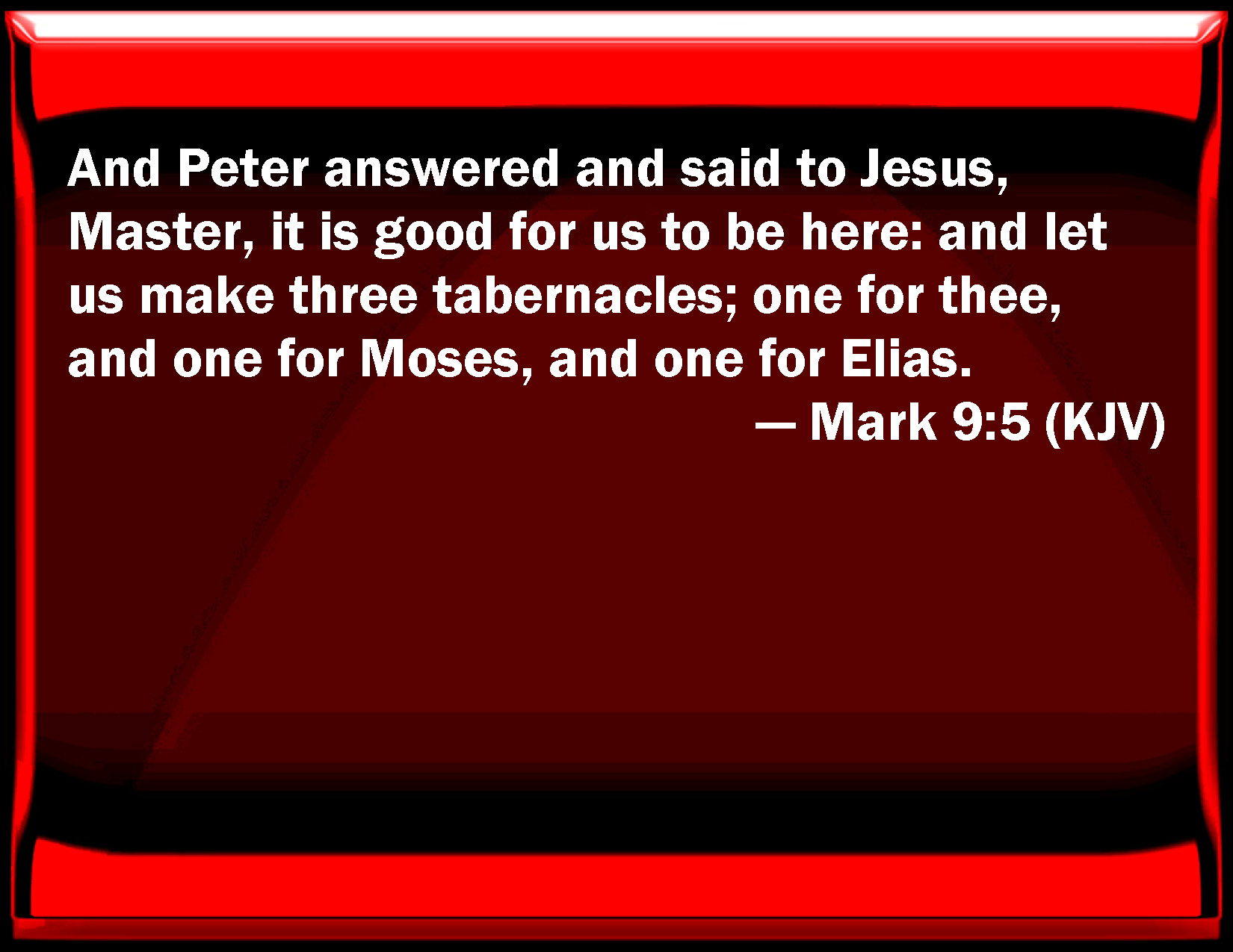 Bible Verse Slide Mark 9:5 And Peter answered and said to Jesus, Master, it is good for us to be here: and let us make three tabernacles; one for you, and one for Moses, and one for Elias. KJV: And Peter answered and said to Jesus, Master, it is good for us to be here: and let us make three tabernacles; one for thee, and one for Moses, and one for Elias. DRB: And Peter answering, said to Jesus: Rabbi, it is good for us to be here: and let us make three tabernacles, one for thee, and one for Moses, and one for Elias. DBT: And Peter answering says to Jesus, Rabbi, it is good that we should be here; and let us make three tabernacles, for thee one, and for Moses one, and for Elias one. ERV: And Peter answereth and saith to Jesus, Rabbi, it is good for us to be here: and let us make three tabernacles; one for thee, and one for Moses, and one for Elijah. WBT: And Peter answered and said to Jesus, Master, it is good for us to be here: and let us make three tabernacles; one for thee, and one for Moses, and one for Elijah. WEB: Peter answered Jesus, "Rabbi, it is good for us to be here. Let's make three tents: one for you, one for Moses, and one for Elijah." YLT: And Peter answering saith to Jesus, 'Rabbi, it is good to us to be here; and we may make three booths, for thee one, and for Moses one, and for Elijah one:'Links Mark 9:5 NIV • Mark 9:5 NLT • Mark 9:5 ESV • Mark 9:5 NASB • Mark 9:5 KJV • Mark 9:5 Interlinear • Mark 9:5 Commentaries • Mark 9:5 Parallel Texts • Mark 9:5 Bible Apps • Mark 9:5 Parallel • Bible Hub |