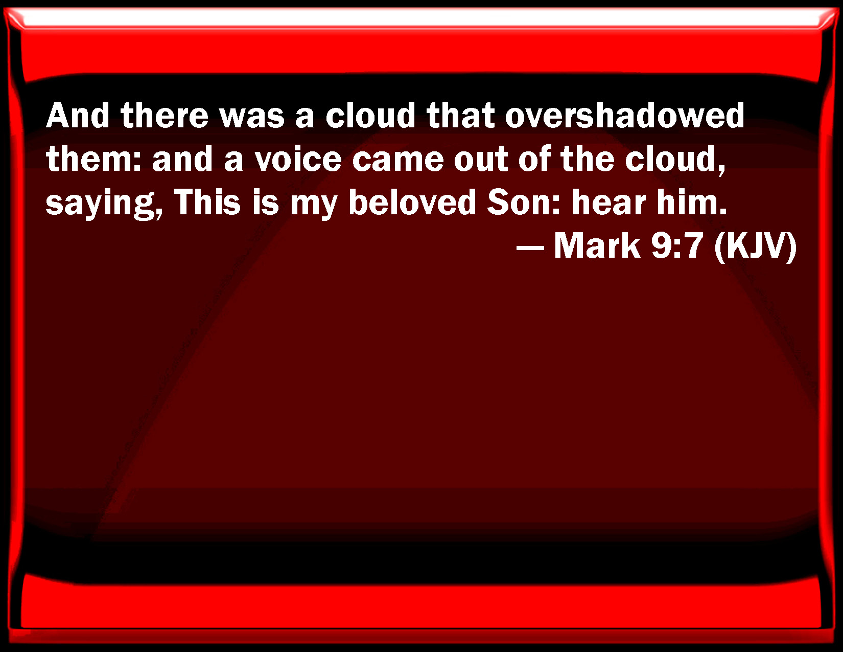 Bible Verse Slide Mark 9:7 And there was a cloud that overshadowed them: and a voice came out of the cloud, saying, This is my beloved Son: hear him. KJV: And there was a cloud that overshadowed them: and a voice came out of the cloud, saying, This is my beloved Son: hear him. DRB: And there was a cloud overshadowing them: and a voice came out of the cloud, saying: This is my most beloved son; hear ye him. DBT: And there came a cloud overshadowing them, and there came a voice out of the cloud, This is my beloved Son: hear him. ERV: And there came a cloud overshadowing them: and there came a voice out of the cloud, This is my beloved Son: hear ye him. WBT: And there was a cloud that overshadowed them: and a voice came out of the cloud, saying, This is my beloved Son: hear him. WEB: A cloud came, overshadowing them, and a voice came out of the cloud, "This is my beloved Son. Listen to him." YLT: And there came a cloud overshadowing them, and there came a voice out of the cloud, saying, 'This is My Son — the Beloved, hear ye him;'Links Mark 9:7 NIV • Mark 9:7 NLT • Mark 9:7 ESV • Mark 9:7 NASB • Mark 9:7 KJV • Mark 9:7 Interlinear • Mark 9:7 Commentaries • Mark 9:7 Parallel Texts • Mark 9:7 Bible Apps • Mark 9:7 Parallel • Bible Hub |