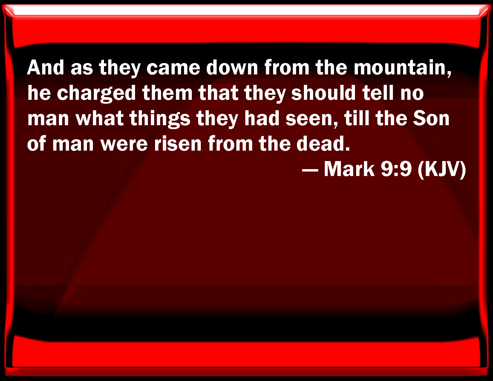 Bible Verse Slide Mark 9:9 And as they came down from the mountain, he charged them that they should tell no man what things they had seen, till the Son of man were risen from the dead. KJV: And as they came down from the mountain, he charged them that they should tell no man what things they had seen, till the Son of man were risen from the dead. DRB: And as they came down from the mountain, he charged them not to tell any man what things they had seen, till the Son of man shall be risen again from the dead. DBT: And as they descended from the mountain, he charged them that they should relate to no one what they had seen, unless when the Son of man should be risen from among the dead. ERV: And as they were coming down from the mountain, he charged them that they should tell no man what things they had seen, save when the Son of man should have risen again from the dead. WBT: And as they came down from the mountain, he charged them that they should tell no man what things they had seen, till the Son of man were risen from the dead. WEB: As they were coming down from the mountain, he commanded them that they should tell no one what things they had seen, until after the Son of Man had risen from the dead. YLT: And as they are coming down from the mount, he charged them that they may declare to no one the things that they saw, except when the Son of Man may rise out of the dead;Links Mark 9:9 NIV • Mark 9:9 NLT • Mark 9:9 ESV • Mark 9:9 NASB • Mark 9:9 KJV • Mark 9:9 Interlinear • Mark 9:9 Commentaries • Mark 9:9 Parallel Texts • Mark 9:9 Bible Apps • Mark 9:9 Parallel • Bible Hub |