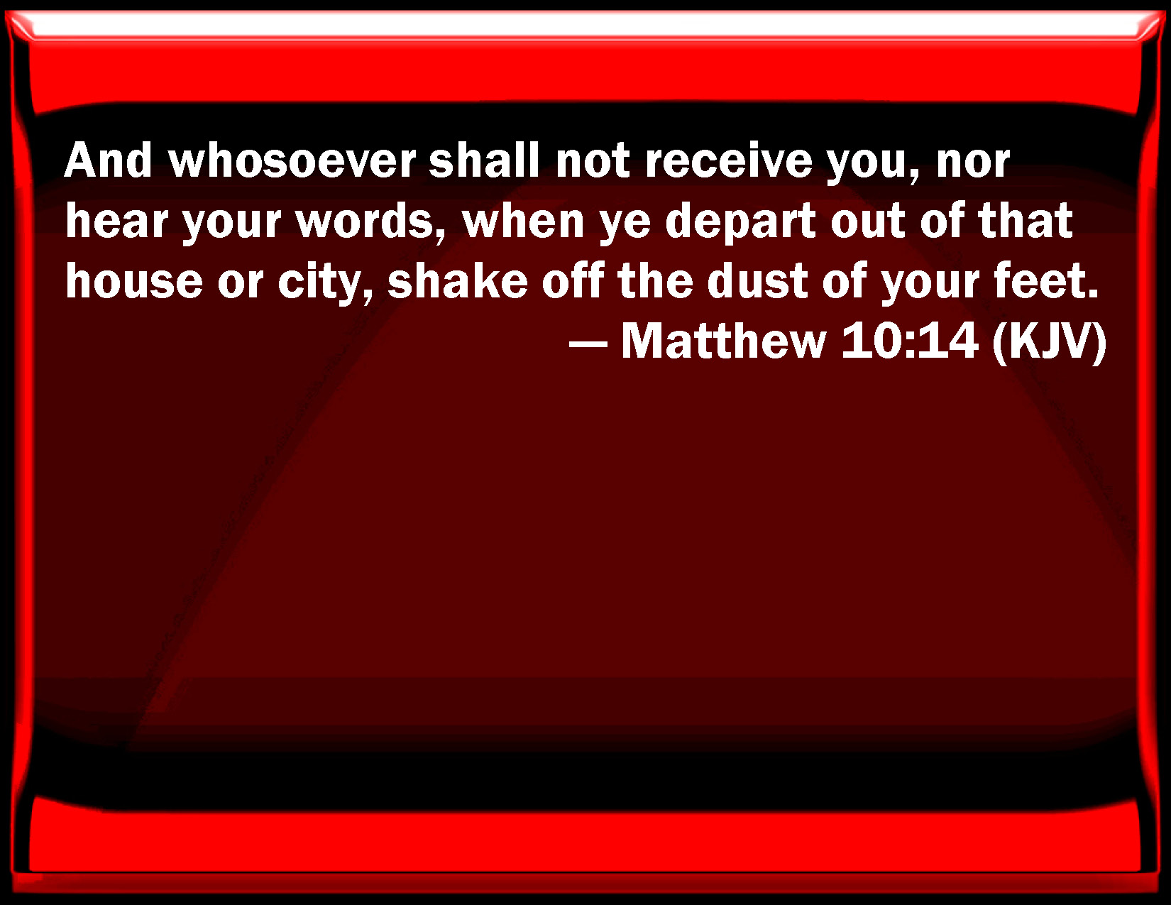 Bible Verse Slide Matthew 10:14 And whoever shall not receive you, nor hear your words, when you depart out of that house or city, shake off the dust of your feet. KJV: And whosoever shall not receive you, nor hear your words, when ye depart out of that house or city, shake off the dust of your feet. DRB: And whosoever shall not receive you, nor hear your words: going forth out of that house or city shake off the dust from your feet. DBT: And whosoever shall not receive you, nor hear your words, as ye go forth out of that house or city, shake off the dust of your feet. ERV: And whosoever shall not receive you, nor hear your words, as ye go forth out of that house or that city, shake off the dust of your feet. WBT: And whoever shall not receive you, nor hear your words, when ye depart from that house, or city, shake off the dust of your feet. WEB: Whoever doesn't receive you, nor hear your words, as you go out of that house or that city, shake off the dust from your feet. YLT: 'And whoever may not receive you nor hear your words, coming forth from that house or city, shake off the dust of your feet,Links Matthew 10:14 NIV • Matthew 10:14 NLT • Matthew 10:14 ESV • Matthew 10:14 NASB • Matthew 10:14 KJV • Matthew 10:14 Interlinear • Matthew 10:14 Commentaries • Matthew 10:14 Parallel Texts • Matthew 10:14 Bible Apps • Matthew 10:14 Parallel • Bible Hub |