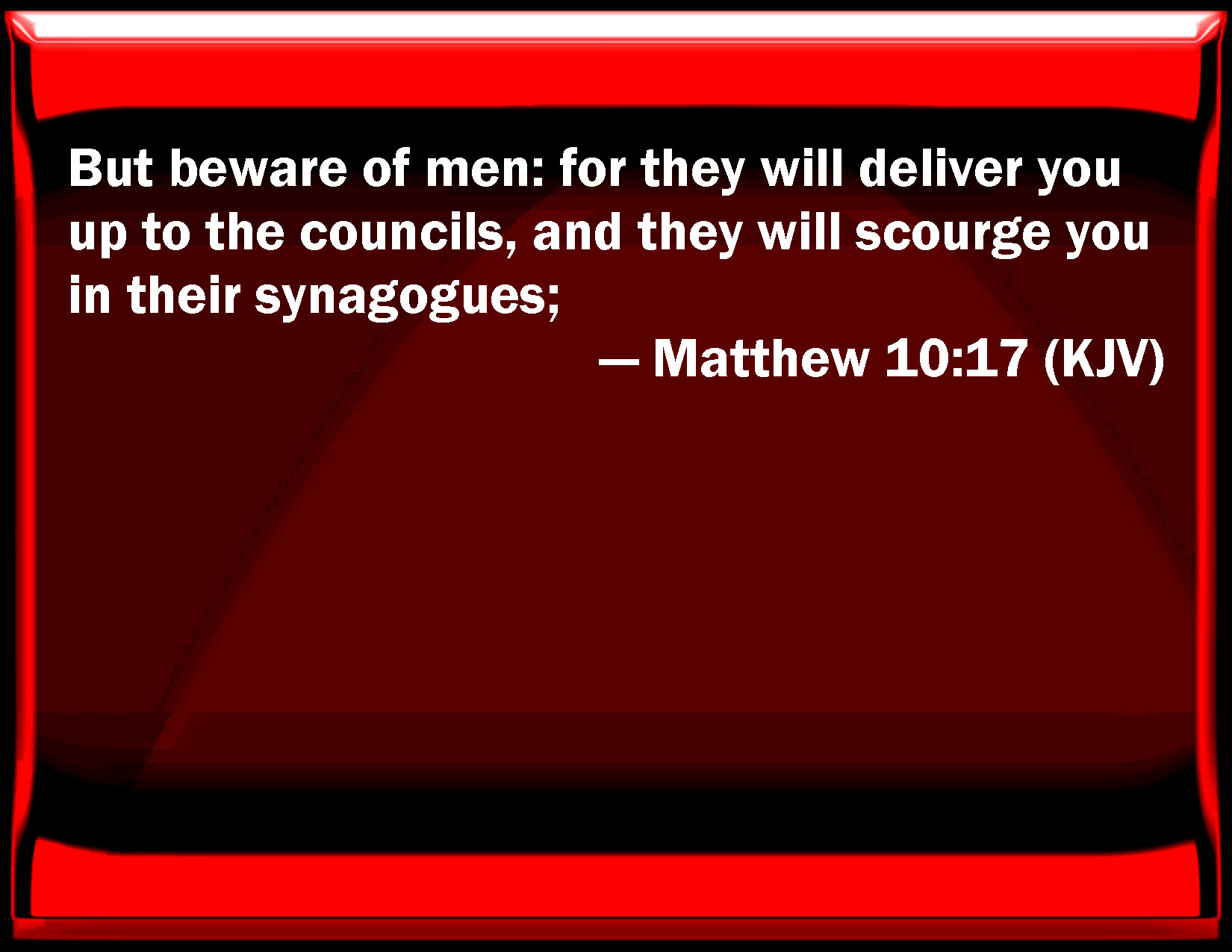 Bible Verse Slide Matthew 10:17 But beware of men: for they will deliver you up to the councils, and they will whip you in their synagogues; KJV: But beware of men: for they will deliver you up to the councils, and they will scourge you in their synagogues; DRB: But beware of men. For they will deliver you up in councils, and they will scourge you in their synagogues. DBT: But beware of men; for they will deliver you up to sanhedrims, and scourge you in their synagogues; ERV: But beware of men: for they will deliver you up to councils, and in their synagogues they will scourge you; WBT: But beware of men: for they will deliver you to the councils, and they will scourge you in their synagogues. WEB: But beware of men: for they will deliver you up to councils, and in their synagogues they will scourge you. YLT: And, take ye heed of men, for they will give you up to sanhedrims, and in their synagogues they will scourge you,Links Matthew 10:17 NIV • Matthew 10:17 NLT • Matthew 10:17 ESV • Matthew 10:17 NASB • Matthew 10:17 KJV • Matthew 10:17 Interlinear • Matthew 10:17 Commentaries • Matthew 10:17 Parallel Texts • Matthew 10:17 Bible Apps • Matthew 10:17 Parallel • Bible Hub |