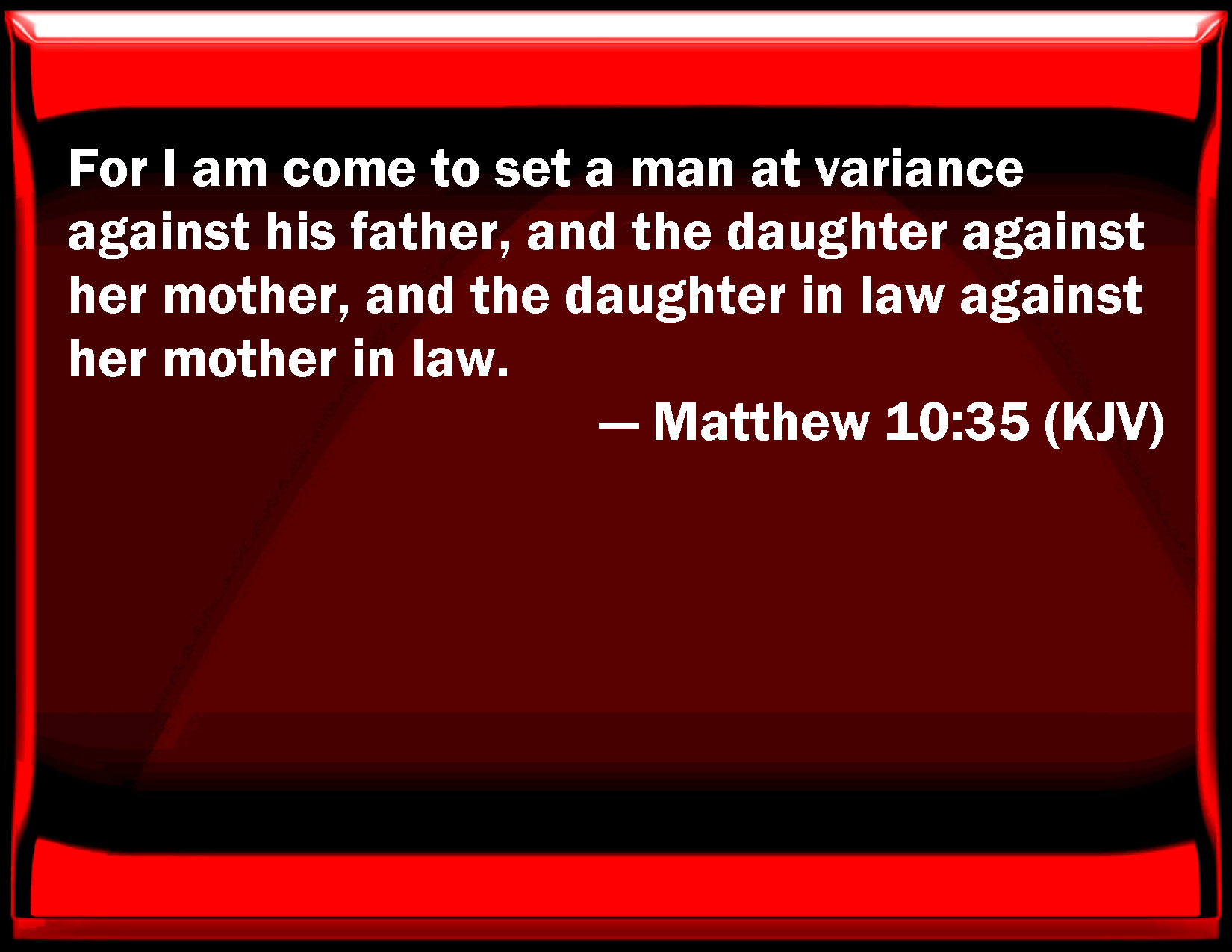 Bible Verse Slide Matthew 10:35 For I am come to set a man at variance against his father, and the daughter against her mother, and the daughter in law against her mother in law. KJV: For I am come to set a man at variance against his father, and the daughter against her mother, and the daughter in law against her mother in law. DRB: For I came to set a man at variance against his father, and the daughter against her mother, and the daughter in law against her mother in law. DBT: For I have come to set a man at variance with his father, and the daughter with her mother, and the daughter-in-law with her mother-in-law; ERV: For I came to set a man at variance against his father, and the daughter against her mother, and the daughter in law against her mother in law: WBT: For I am come to set a man at variance against his father, and the daughter against her mother, and the daughter-in-law against her mother-in-law. WEB: For I came to set a man at odds against his father, and a daughter against her mother, and a daughter-in-law against her mother-in-law. YLT: for I came to set a man at variance against his father, and a daughter against her mother, and a daughter-in-law against her mother-in-law,Links Matthew 10:35 NIV • Matthew 10:35 NLT • Matthew 10:35 ESV • Matthew 10:35 NASB • Matthew 10:35 KJV • Matthew 10:35 Interlinear • Matthew 10:35 Commentaries • Matthew 10:35 Parallel Texts • Matthew 10:35 Bible Apps • Matthew 10:35 Parallel • Bible Hub |