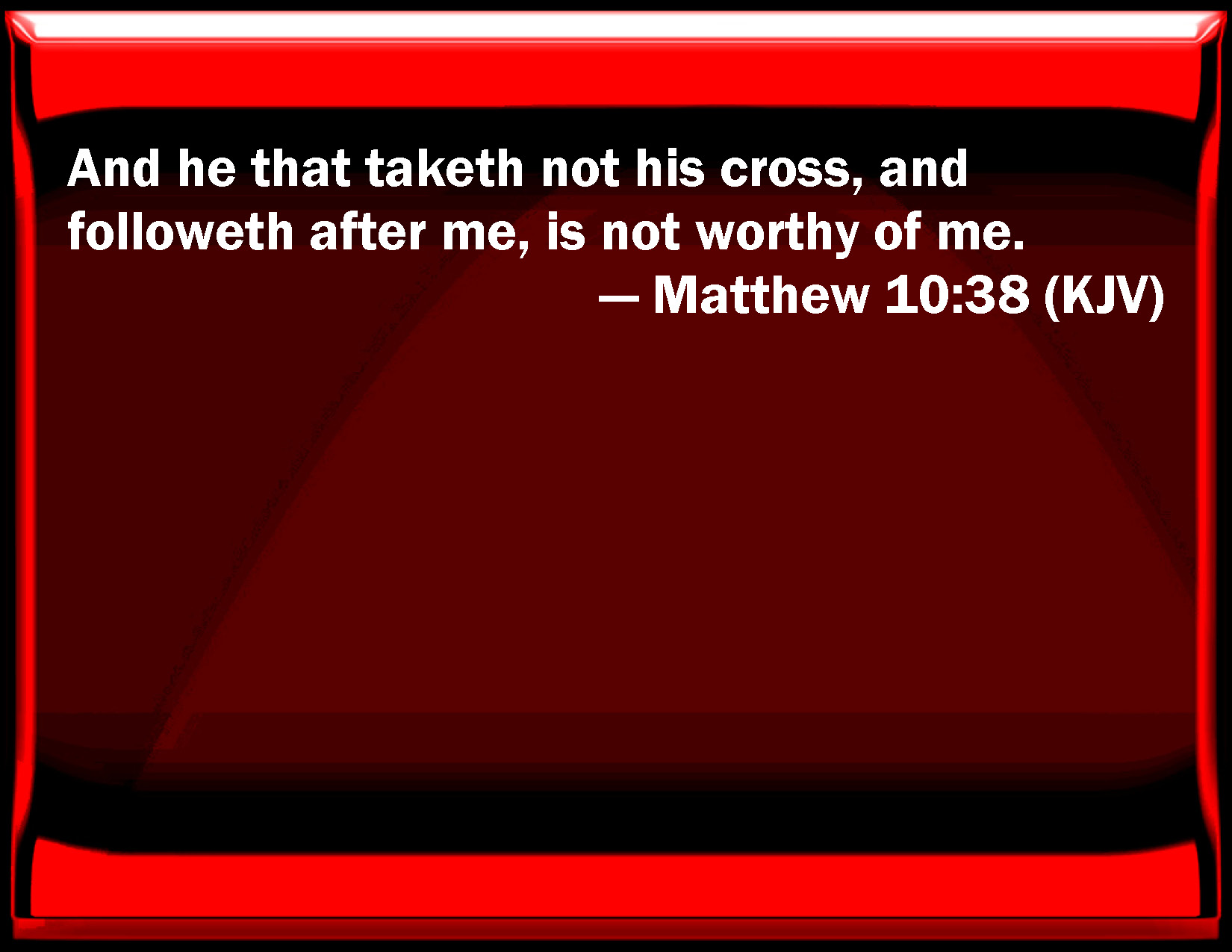Bible Verse Slide Matthew 10:38 And he that takes not his cross, and follows after me, is not worthy of me. KJV: And he that taketh not his cross, and followeth after me, is not worthy of me. DRB: And he that taketh not up his cross, and followeth me, is not worthy of me. DBT: And he who does not take up his cross and follow after me is not worthy of me. ERV: And he that doth not take his cross and follow after me, is not worthy of me. WBT: And he that taketh not his cross, and followeth me, is not worthy of me. WEB: He who doesn't take his cross and follow after me, isn't worthy of me. YLT: and whoever doth not receive his cross and follow after me, is not worthy of me.Links Matthew 10:38 NIV • Matthew 10:38 NLT • Matthew 10:38 ESV • Matthew 10:38 NASB • Matthew 10:38 KJV • Matthew 10:38 Interlinear • Matthew 10:38 Commentaries • Matthew 10:38 Parallel Texts • Matthew 10:38 Bible Apps • Matthew 10:38 Parallel • Bible Hub |