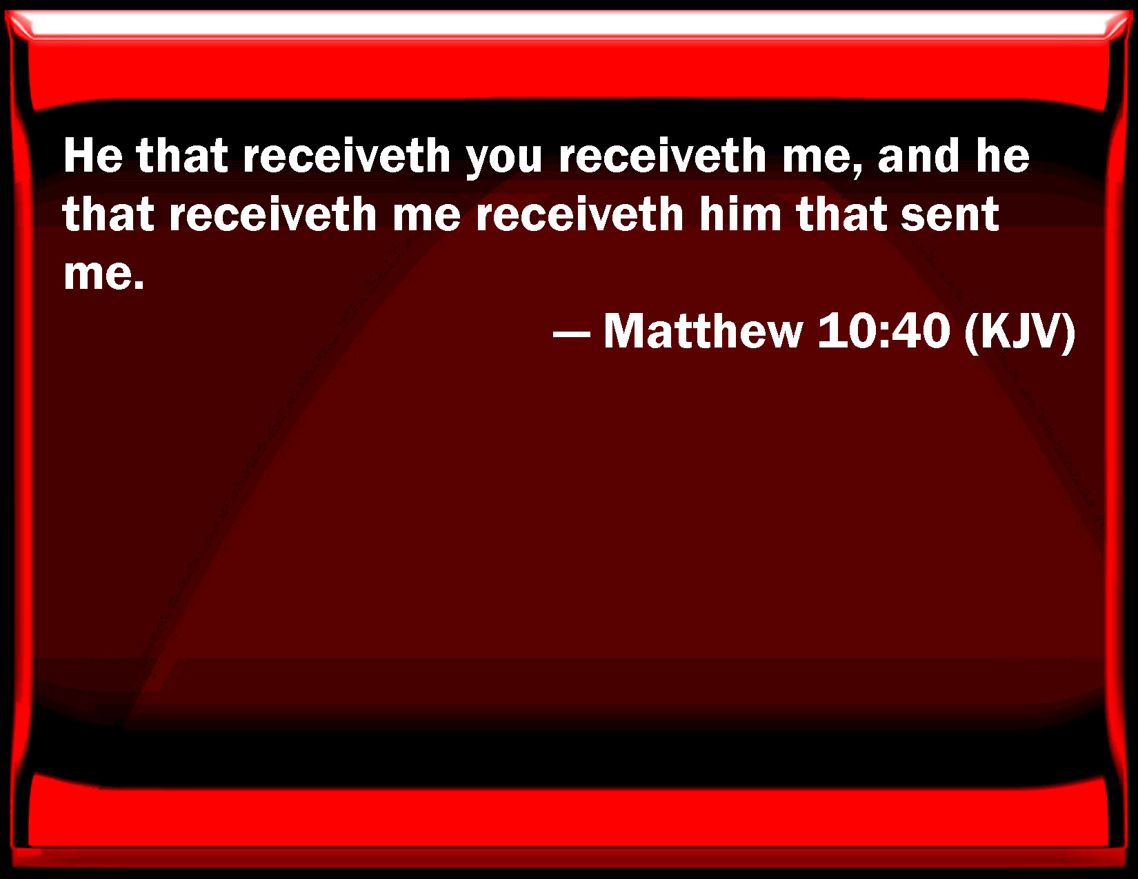 Bible Verse Slide Matthew 10:40 He that receives you receives me, and he that receives me receives him that sent me. KJV: He that receiveth you receiveth me, and he that receiveth me receiveth him that sent me. DRB: He that receiveth you, receiveth me: and he that receiveth me, receiveth him that sent me. DBT: He that receives you receives me, and he that receives me receives him that sent me. ERV: He that receiveth you receiveth me, and he that receiveth me receiveth him that sent me. WBT: He that receiveth you, receiveth me, and he that receiveth me, receiveth him that sent me. WEB: He who receives you receives me, and he who receives me receives him who sent me. YLT: 'He who is receiving you doth receive me, and he who is receiving me doth receive Him who sent me,Links Matthew 10:40 NIV • Matthew 10:40 NLT • Matthew 10:40 ESV • Matthew 10:40 NASB • Matthew 10:40 KJV • Matthew 10:40 Interlinear • Matthew 10:40 Commentaries • Matthew 10:40 Parallel Texts • Matthew 10:40 Bible Apps • Matthew 10:40 Parallel • Bible Hub |