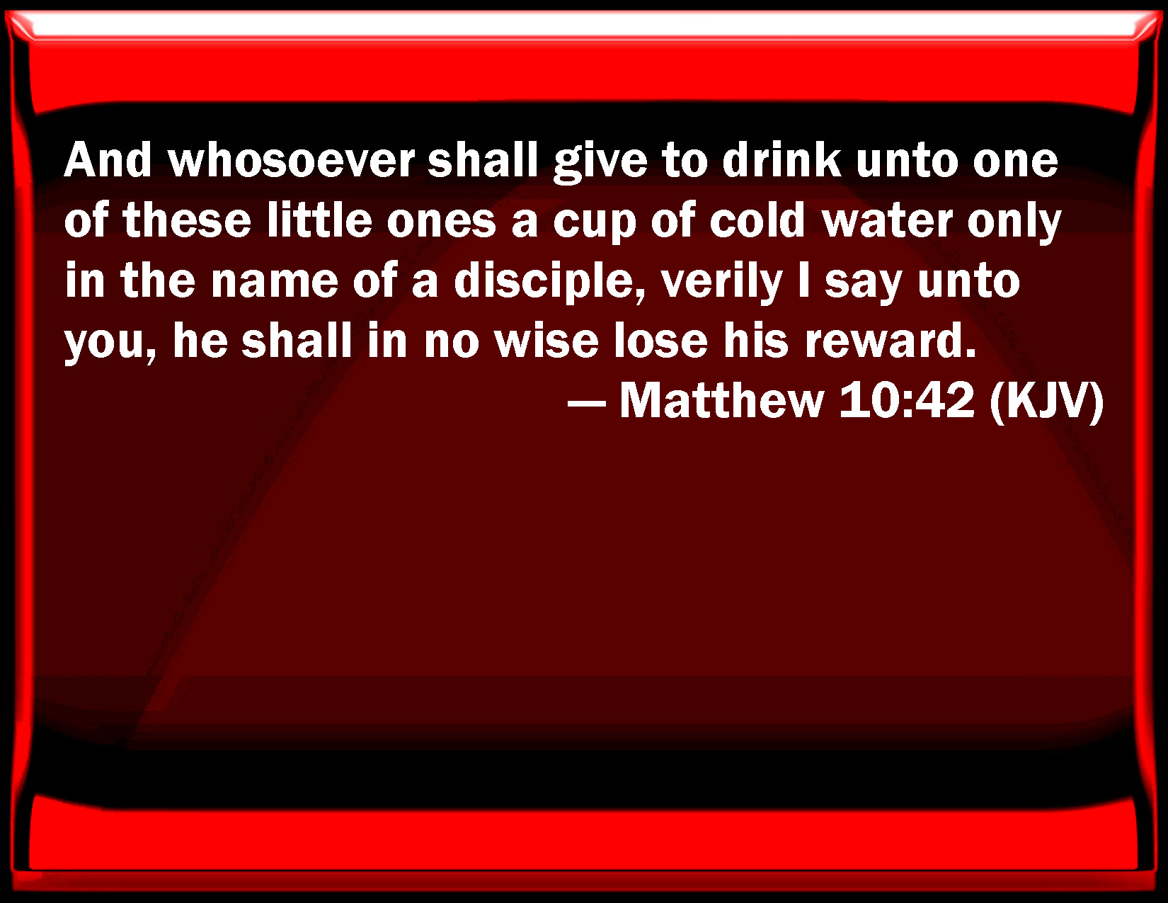 Bible Verse Slide Matthew 10:42 And whoever shall give to drink to one of these little ones a cup of cold water only in the name of a disciple, truly I say to you, he shall in no wise lose his reward. KJV: And whosoever shall give to drink unto one of these little ones a cup of cold water only in the name of a disciple, verily I say unto you, he shall in no wise lose his reward. DRB: And whosoever shall give to drink to one of these little ones a cup of cold water only in the name of a disciple, amen I say to you, he shall not lose his reward. DBT: And whosoever shall give to drink to one of these little ones a cup of cold water only, in the name of a disciple, verily I say unto you, he shall in no wise lose his reward. ERV: And whosoever shall give to drink unto one of these little ones a cup of cold water only, in the name of a disciple, verily I say unto you, he shall in no wise lose his reward. WBT: And whoever shall give to drink to one of these little ones, a cup of cold water only, in the name of a disciple, verily, I say to you, he shall in no wise lose his reward. WEB: Whoever gives one of these little ones just a cup of cold water to drink in the name of a disciple, most certainly I tell you he will in no way lose his reward." YLT: and whoever may give to drink to one of these little ones a cup of cold water only in the name of a disciple, verily I say to you, he may not lose his reward.'Links Matthew 10:42 NIV • Matthew 10:42 NLT • Matthew 10:42 ESV • Matthew 10:42 NASB • Matthew 10:42 KJV • Matthew 10:42 Interlinear • Matthew 10:42 Commentaries • Matthew 10:42 Parallel Texts • Matthew 10:42 Bible Apps • Matthew 10:42 Parallel • Bible Hub |