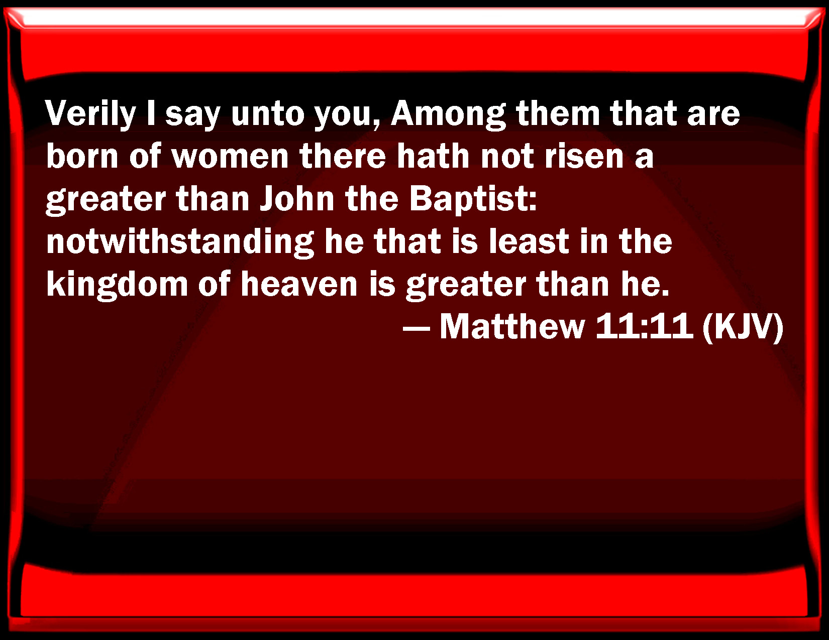 Bible Verse Slide Matthew 11:11 Truly I say to you, Among them that are born of women there has not risen a greater than John the Baptist: notwithstanding he that is least in the kingdom of heaven is greater than he. KJV: Verily I say unto you, Among them that are born of women there hath not risen a greater than John the Baptist: notwithstanding he that is least in the kingdom of heaven is greater than he. DRB: Amen I say to you, there hath not risen among them that are born of women a greater than John the Baptist: yet he that is the lesser in the kingdom of heaven is greater than he. DBT: Verily I say to you, that there is not arisen among the born of women a greater than John the baptist. But he who is a little one in the kingdom of the heavens is greater than he. ERV: Verily I say unto you, Among them that are born of women there hath not arisen a greater than John the Baptist: yet he that is but little in the kingdom of heaven is greater than he. WBT: Verily, I say to you, among them that are born of women, there hath not risen a greater than John the Baptist: notwithstanding, he that is least in the kingdom of heaven, is greater than he. WEB: Most certainly I tell you, among those who are born of women there has not arisen anyone greater than John the Baptizer; yet he who is least in the Kingdom of Heaven is greater than he. YLT: Verily I say to you, there hath not risen, among those born of women, a greater than John the Baptist, but he who is least in the reign of the heavens is greater than he.Links Matthew 11:11 NIV • Matthew 11:11 NLT • Matthew 11:11 ESV • Matthew 11:11 NASB • Matthew 11:11 KJV • Matthew 11:11 Interlinear • Matthew 11:11 Commentaries • Matthew 11:11 Parallel Texts • Matthew 11:11 Bible Apps • Matthew 11:11 Parallel • Bible Hub |