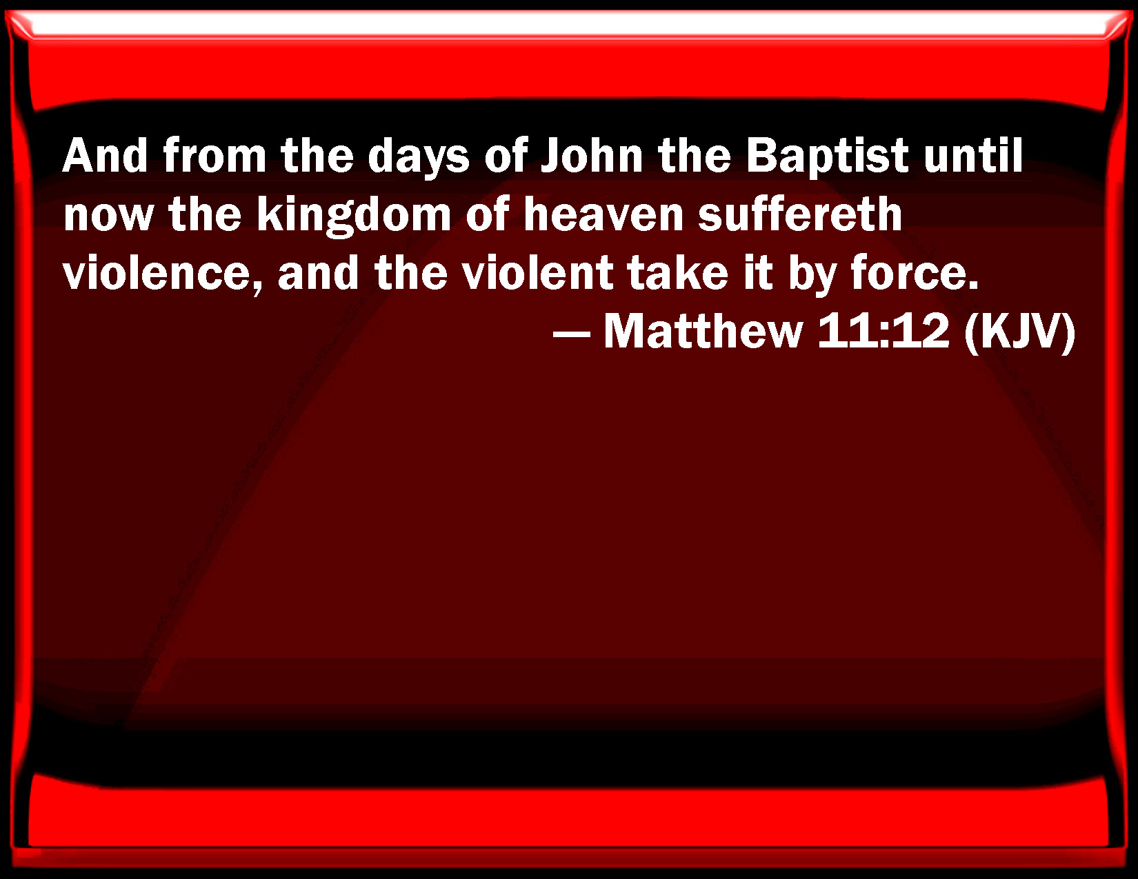 Bible Verse Slide Matthew 11:12 And from the days of John the Baptist until now the kingdom of heaven suffers violence, and the violent take it by force. KJV: And from the days of John the Baptist until now the kingdom of heaven suffereth violence, and the violent take it by force. DRB: And from the days of John the Baptist until now, the kingdom of heaven suffereth violence, and the violent bear it away. DBT: But from the days of John the baptist until now, the kingdom of the heavens is taken by violence, and the violent seize on it. ERV: And from the days of John the Baptist until now the kingdom of heaven suffereth violence, and men of violence take it by force. WBT: And from the days of John the Baptist, until now, the kingdom of heaven suffereth violence, and the violent take it by force. WEB: From the days of John the Baptizer until now, the Kingdom of Heaven suffers violence, and the violent take it by force. YLT: 'And, from the days of John the Baptist till now, the reign of the heavens doth suffer violence, and violent men do take it by force,Links Matthew 11:12 NIV • Matthew 11:12 NLT • Matthew 11:12 ESV • Matthew 11:12 NASB • Matthew 11:12 KJV • Matthew 11:12 Interlinear • Matthew 11:12 Commentaries • Matthew 11:12 Parallel Texts • Matthew 11:12 Bible Apps • Matthew 11:12 Parallel • Bible Hub |