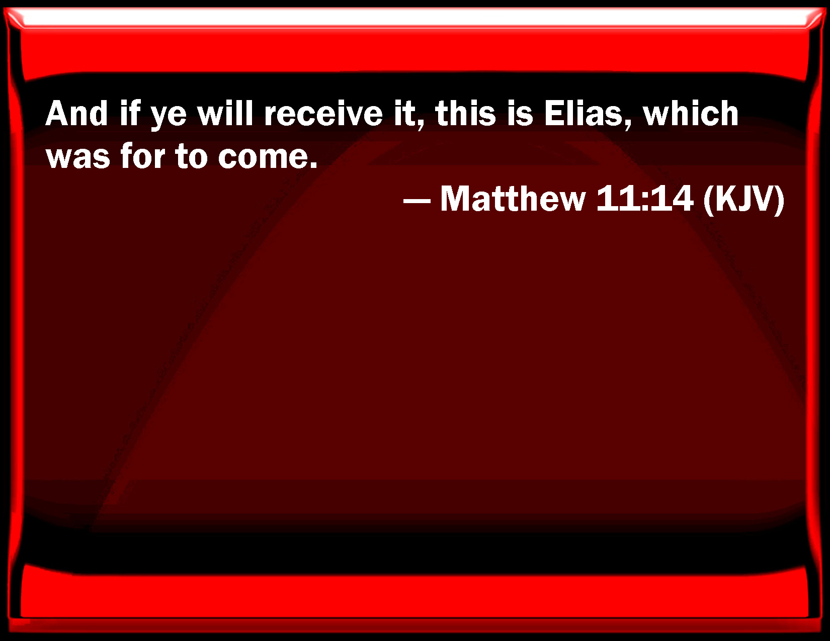 Bible Verse Slide Matthew 11:14 And if you will receive it, this is Elias, which was for to come. KJV: And if ye will receive it, this is Elias, which was for to come. DRB: And if you will receive it, he is Elias that is to come. DBT: And if ye will receive it, this is Elias, who is to come. ERV: And if ye are willing to receive it, this is Elijah, which is to come. WBT: And if ye will receive it, this is Elijah who was to come. WEB: If you are willing to receive it, this is Elijah, who is to come. YLT: and if ye are willing to receive it, he is Elijah who was about to come;Links Matthew 11:14 NIV • Matthew 11:14 NLT • Matthew 11:14 ESV • Matthew 11:14 NASB • Matthew 11:14 KJV • Matthew 11:14 Interlinear • Matthew 11:14 Commentaries • Matthew 11:14 Parallel Texts • Matthew 11:14 Bible Apps • Matthew 11:14 Parallel • Bible Hub |