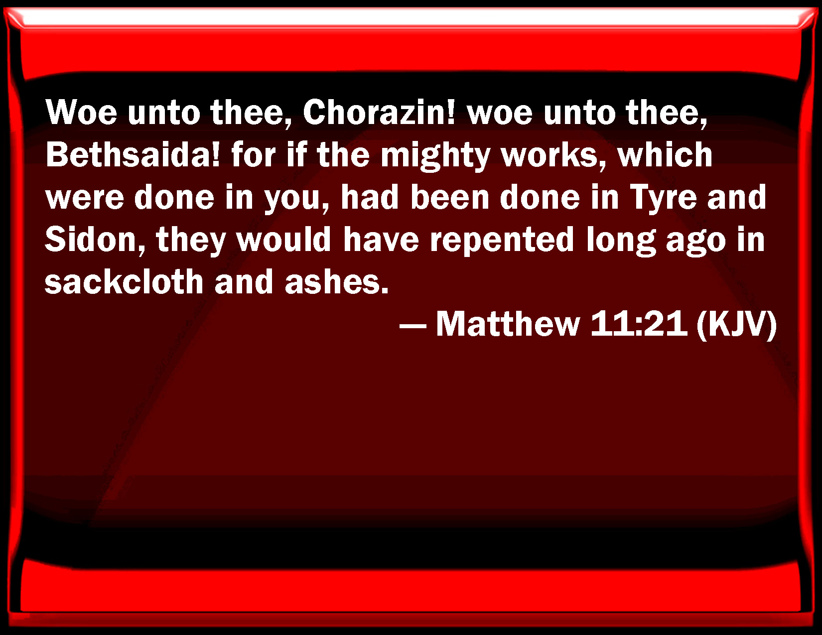 Bible Verse Slide Matthew 11:21 Woe to you, Chorazin! woe to you, Bethsaida! for if the mighty works, which were done in you, had been done in Tyre and Sidon, they would have repented long ago in sackcloth and ashes. KJV: Woe unto thee, Chorazin! woe unto thee, Bethsaida! for if the mighty works, which were done in you, had been done in Tyre and Sidon, they would have repented long ago in sackcloth and ashes. DRB: Woe to thee, Corozain, woe to thee, Bethsaida: for if in Tyre and Sidon had been wrought the miracles that have been wrought in you, they had long ago done penance in sackcloth and ashes. DBT: Woe to thee, Chorazin! woe to thee Bethsaida! for if the works of power which have taken place in you, had taken place in Tyre and Sidon, they had long ago repented in sackcloth and ashes. ERV: Woe unto thee, Chorazin! woe unto thee, Bethsaida! for if the mighty works had been done in Tyre and Sidon which were done in you, they would have repented long ago in sackcloth and ashes. WBT: Woe to thee, Chorazin; woe to thee, Bethsaida: for if the mighty works which have been done in you had been done in Tyre and Sidon, they would have repented long ago in sackcloth and ashes. WEB: "Woe to you, Chorazin! Woe to you, Bethsaida! For if the mighty works had been done in Tyre and Sidon which were done in you, they would have repented long ago in sackcloth and ashes. YLT: 'Woe to thee, Chorazin! woe to thee, Bethsaida! because, if in Tyre and Sidon had been done the mighty works that were done in you, long ago in sackcloth and ashes they had reformed;Links Matthew 11:21 NIV • Matthew 11:21 NLT • Matthew 11:21 ESV • Matthew 11:21 NASB • Matthew 11:21 KJV • Matthew 11:21 Interlinear • Matthew 11:21 Commentaries • Matthew 11:21 Parallel Texts • Matthew 11:21 Bible Apps • Matthew 11:21 Parallel • Bible Hub |