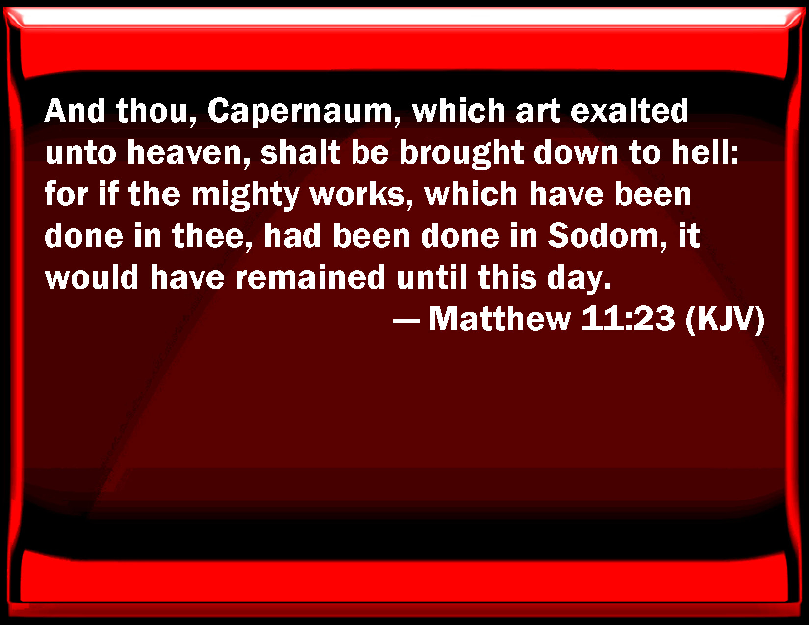 Bible Verse Slide Matthew 11:23 And you, Capernaum, which are exalted to heaven, shall be brought down to hell: for if the mighty works, which have been done in you, had been done in Sodom, it would have remained until this day. KJV: And thou, Capernaum, which art exalted unto heaven, shalt be brought down to hell: for if the mighty works, which have been done in thee, had been done in Sodom, it would have remained until this day. DRB: And thou Capharnaum, shalt thou be exalted up to heaven? thou shalt go down even unto hell. For if in Sodom had been wrought the miracles that have been wrought in thee, perhaps it had remained unto this day. DBT: And thou, Capernaum, who hast been raised up to heaven, shalt be brought down even to hades. For if the works of power which have taken place in thee, had taken place in Sodom, it had remained until this day. ERV: And thou, Capernaum, shalt thou be exalted unto heaven? thou shalt go down unto Hades: for if the mighty works had been done in Sodom which were done in thee, it would have remained until this day. WBT: And thou, Capernaum, which art exalted to heaven, shalt be brought down to hell: for if the mighty works which have been done in thee, had been done in Sodom, it would have remained until this day. WEB: You, Capernaum, who are exalted to heaven, you will go down to Hades. For if the mighty works had been done in Sodom which were done in you, it would have remained until this day. YLT: 'And thou, Capernaum, which unto the heaven wast exalted, unto hades shalt be brought down, because if in Sodom had been done the mighty works that were done in thee, it had remained unto this day;Links Matthew 11:23 NIV • Matthew 11:23 NLT • Matthew 11:23 ESV • Matthew 11:23 NASB • Matthew 11:23 KJV • Matthew 11:23 Interlinear • Matthew 11:23 Commentaries • Matthew 11:23 Parallel Texts • Matthew 11:23 Bible Apps • Matthew 11:23 Parallel • Bible Hub |