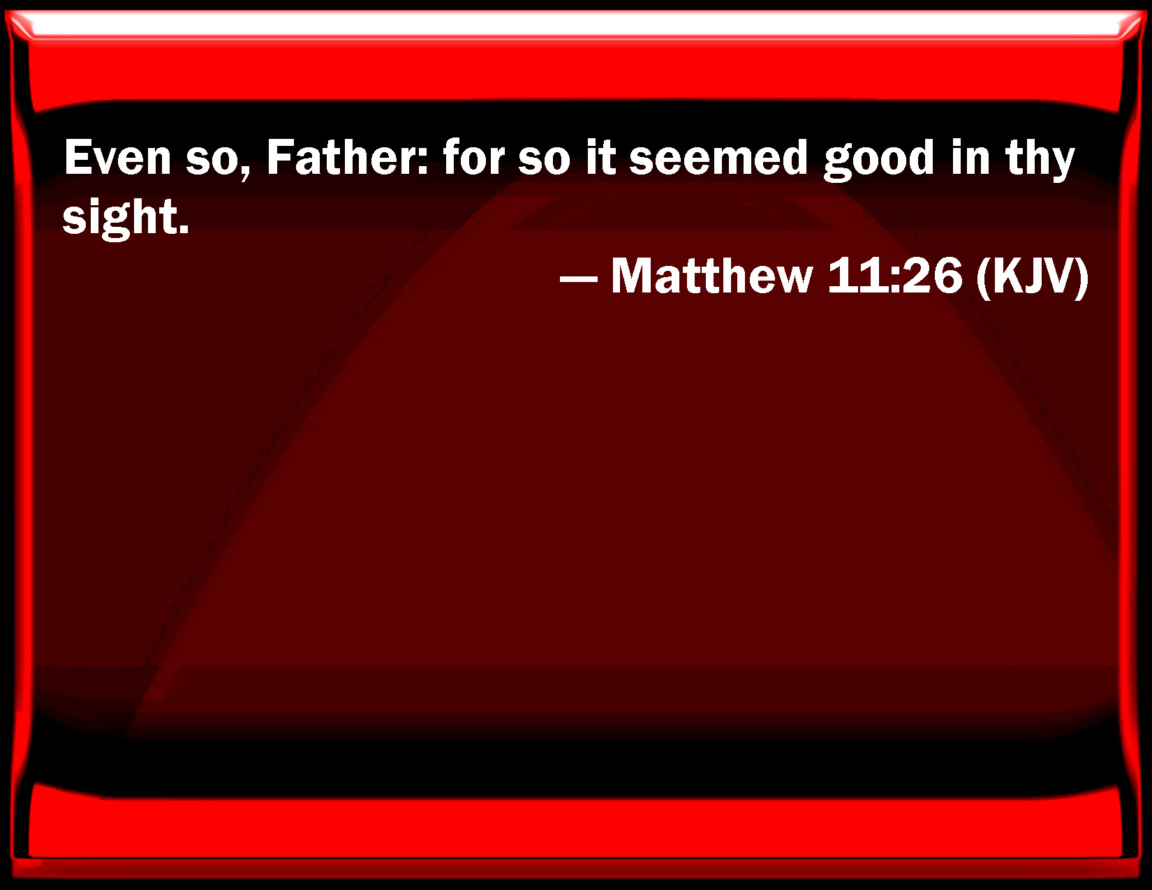 Bible Verse Slide Matthew 11:26 Even so, Father: for so it seemed good in your sight. KJV: Even so, Father: for so it seemed good in thy sight. DRB: Yea, Father; for so hath it seemed good in thy sight. DBT: Yea, Father, for thus has it been well-pleasing in thy sight. ERV: yea, Father, for so it was well-pleasing in thy sight. WBT: Even so, Father, for so it seemed good in thy sight. WEB: Yes, Father, for so it was well-pleasing in your sight. YLT: Yes, Father, because so it was good pleasure before Thee.Links Matthew 11:26 NIV • Matthew 11:26 NLT • Matthew 11:26 ESV • Matthew 11:26 NASB • Matthew 11:26 KJV • Matthew 11:26 Interlinear • Matthew 11:26 Commentaries • Matthew 11:26 Parallel Texts • Matthew 11:26 Bible Apps • Matthew 11:26 Parallel • Bible Hub |