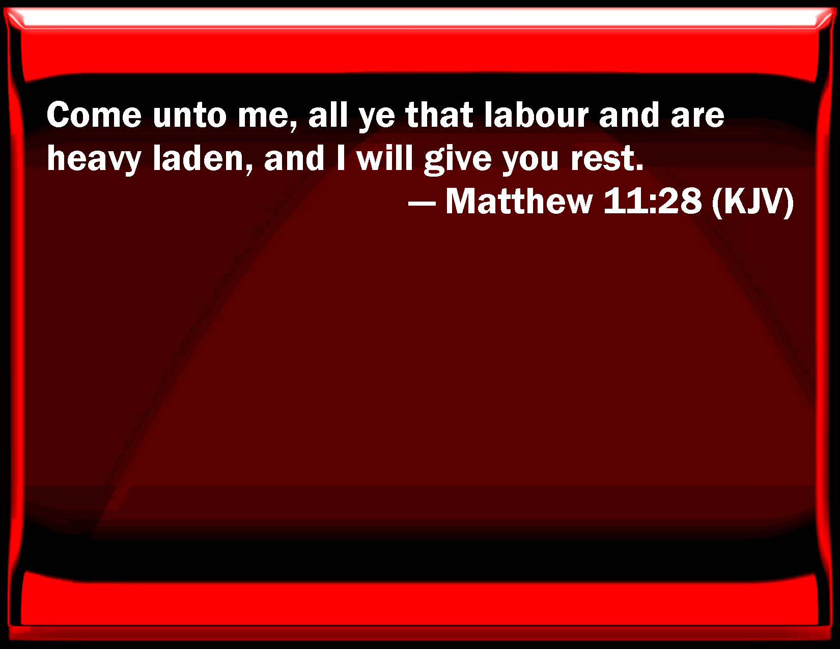 Bible Verse Slide Matthew 11:28 Come to me, all you that labor and are heavy laden, and I will give you rest. KJV: Come unto me, all ye that labour and are heavy laden, and I will give you rest. DRB: Come to me, all you that labour, and are burdened, and I will refresh you. DBT: Come to me, all ye who labour and are burdened, and I will give you rest. ERV: Come unto me, all ye that labour and are heavy laden, and I will give you rest. WBT: Come to me, all ye that labor, and are heavy laden, and I will give you rest. WEB: "Come to me, all you who labor and are heavily burdened, and I will give you rest. YLT: 'Come unto me, all ye labouring and burdened ones, and I will give you rest,Links Matthew 11:28 NIV • Matthew 11:28 NLT • Matthew 11:28 ESV • Matthew 11:28 NASB • Matthew 11:28 KJV • Matthew 11:28 Interlinear • Matthew 11:28 Commentaries • Matthew 11:28 Parallel Texts • Matthew 11:28 Bible Apps • Matthew 11:28 Parallel • Bible Hub |
