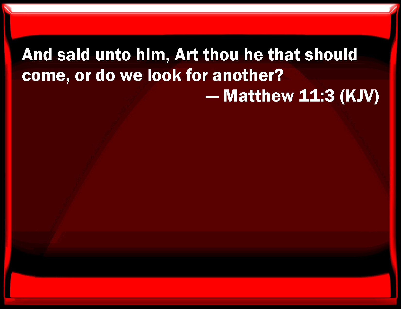 Bible Verse Slide Matthew 11:3 And said to him, Are you he that should come, or do we look for another? KJV: And said unto him, Art thou he that should come, or do we look for another? DRB: Art thou he that art to come, or look we for another? DBT: and said to him, Art thou the coming one? or are we to wait for another? ERV: and said unto him, Art thou he that cometh, or look we for another? WBT: And said to him, Art thou he that should come, or do we look for another? WEB: and said to him, "Are you he who comes, or should we look for another?" YLT: said to him, 'Art thou He who is coming, or for another do we look?'Links Matthew 11:3 NIV • Matthew 11:3 NLT • Matthew 11:3 ESV • Matthew 11:3 NASB • Matthew 11:3 KJV • Matthew 11:3 Interlinear • Matthew 11:3 Commentaries • Matthew 11:3 Parallel Texts • Matthew 11:3 Bible Apps • Matthew 11:3 Parallel • Bible Hub |