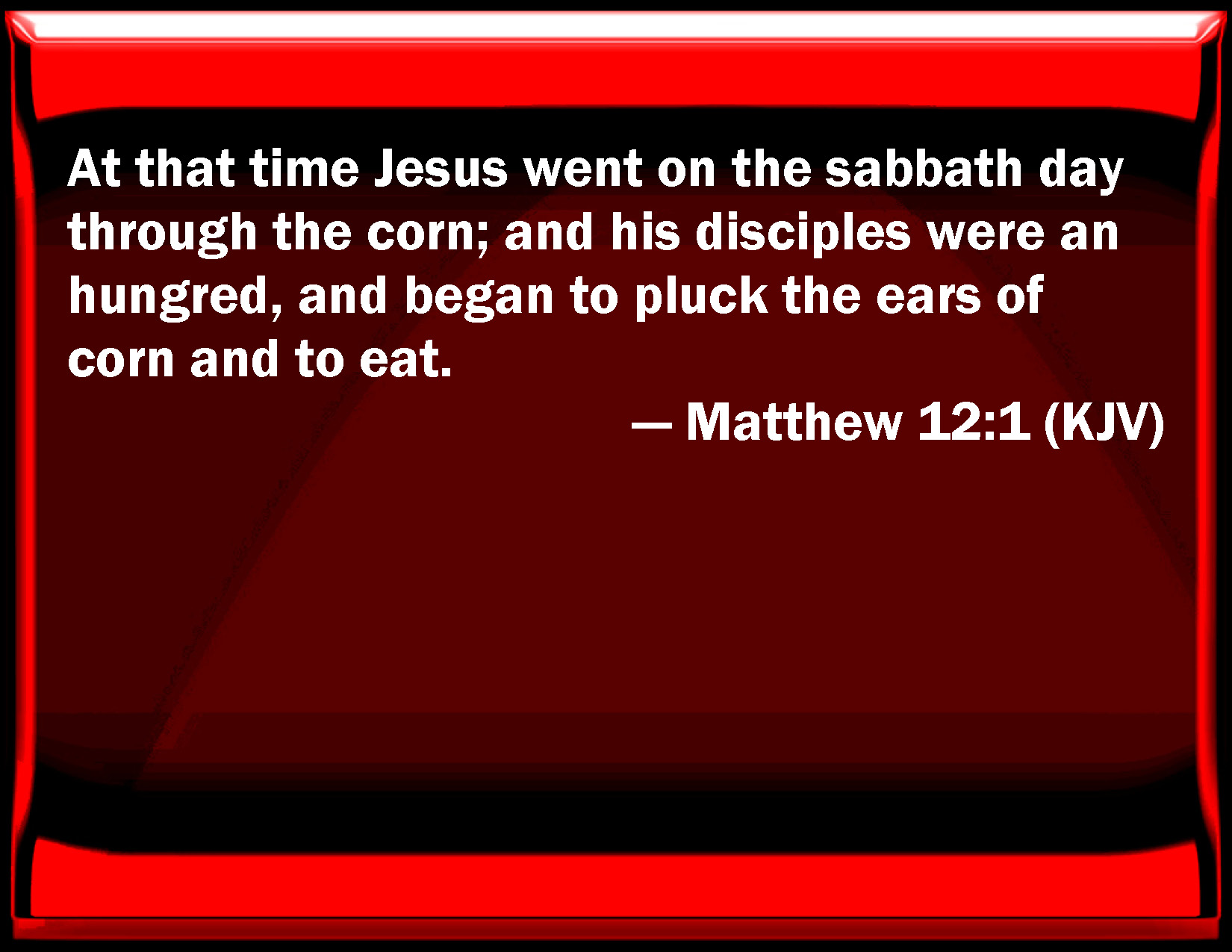 Bible Verse Slide Matthew 12:1 At that time Jesus went on the sabbath day through the corn; and his disciples were an hungered, and began to pluck the ears of corn and to eat. KJV: At that time Jesus went on the sabbath day through the corn; and his disciples were an hungred, and began to pluck the ears of corn, and to eat. DRB: AT that time Jesus went through the corn on the sabbath: and his disciples being hungry, began to pluck the ears, and to eat. DBT: At that time Jesus went on the sabbath through the cornfields; and his disciples were hungry, and began to pluck the ears and to eat. ERV: At that season Jesus went on the sabbath day through the cornfields; and his disciples were an hungred, and began to pluck ears of corn, and to eat. WBT: At that time Jesus went on the sabbath through the corn, and his disciples were hungry, and began to pluck the ears of corn, and to eat. WEB: At that time, Jesus went on the Sabbath day through the grain fields. His disciples were hungry and began to pluck heads of grain and to eat. YLT: At that time did Jesus go on the sabbaths through the corn, and his disciples were hungry, and they began to pluck ears, and to eat,Links Matthew 12:1 NIV • Matthew 12:1 NLT • Matthew 12:1 ESV • Matthew 12:1 NASB • Matthew 12:1 KJV • Matthew 12:1 Interlinear • Matthew 12:1 Commentaries • Matthew 12:1 Parallel Texts • Matthew 12:1 Bible Apps • Matthew 12:1 Parallel • Bible Hub |