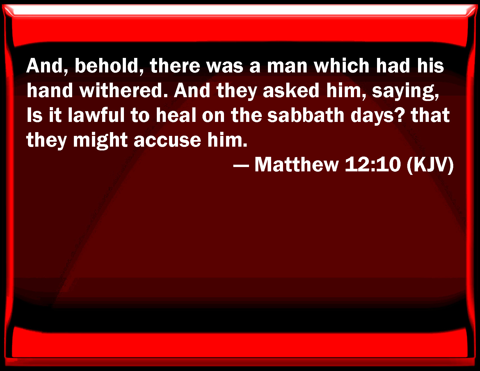 Bible Verse Slide Matthew 12:10 And, behold, there was a man which had his hand withered. And they asked him, saying, Is it lawful to heal on the sabbath days? that they might accuse him. KJV: And, behold, there was a man which had his hand withered. And they asked him, saying, Is it lawful to heal on the sabbath days? that they might accuse him. DRB: And behold there was a man who had a withered hand, and they asked him, saying: Is it lawful to heal on the sabbath days? that they might accuse him. DBT: And behold, there was a man having his hand withered. And they asked him, saying, Is it lawful to heal on the sabbath? that they might accuse him. ERV: and behold, a man having a withered hand. And they asked him, saying, Is it lawful to heal on the sabbath day? that they might accuse him. WBT: And behold, there was a man who had his hand withered. And they asked him, saying, Is it lawful to heal on the sabbath? that they might accuse him. WEB: And behold there was a man with a withered hand. They asked him, "Is it lawful to heal on the Sabbath day?" that they might accuse him. YLT: and lo, there was a man having the hand withered, and they questioned him, saying, 'Is it lawful to heal on the sabbaths?' that they might accuse him.Links Matthew 12:10 NIV • Matthew 12:10 NLT • Matthew 12:10 ESV • Matthew 12:10 NASB • Matthew 12:10 KJV • Matthew 12:10 Interlinear • Matthew 12:10 Commentaries • Matthew 12:10 Parallel Texts • Matthew 12:10 Bible Apps • Matthew 12:10 Parallel • Bible Hub |