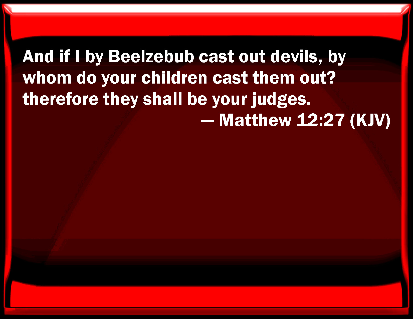 Bible Verse Slide Matthew 12:27 And if I by Beelzebub cast out devils, by whom do your children cast them out? therefore they shall be your judges. KJV: And if I by Beelzebub cast out devils, by whom do your children cast them out? therefore they shall be your judges. DRB: And if I by Beelzebub cast out devils, by whom do your children cast them out? Therefore they shall be your judges. DBT: And if I cast out demons by Beelzebub, your sons, by whom do they cast them out? For this reason they shall be your judges. ERV: And if I by Beelzebub cast out devils, by whom do your sons cast them out? therefore shall they be your judges. WBT: And if I by Beelzebub cast out demons, by whom do your children expel them? therefore they shall be your judges. WEB: If I by Beelzebul cast out demons, by whom do your children cast them out? Therefore they will be your judges. YLT: And if I, by Beelzeboul, do cast out the demons, your sons — by whom do they cast out? because of this they — they shall be your judges.Links Matthew 12:27 NIV • Matthew 12:27 NLT • Matthew 12:27 ESV • Matthew 12:27 NASB • Matthew 12:27 KJV • Matthew 12:27 Interlinear • Matthew 12:27 Commentaries • Matthew 12:27 Parallel Texts • Matthew 12:27 Bible Apps • Matthew 12:27 Parallel • Bible Hub |