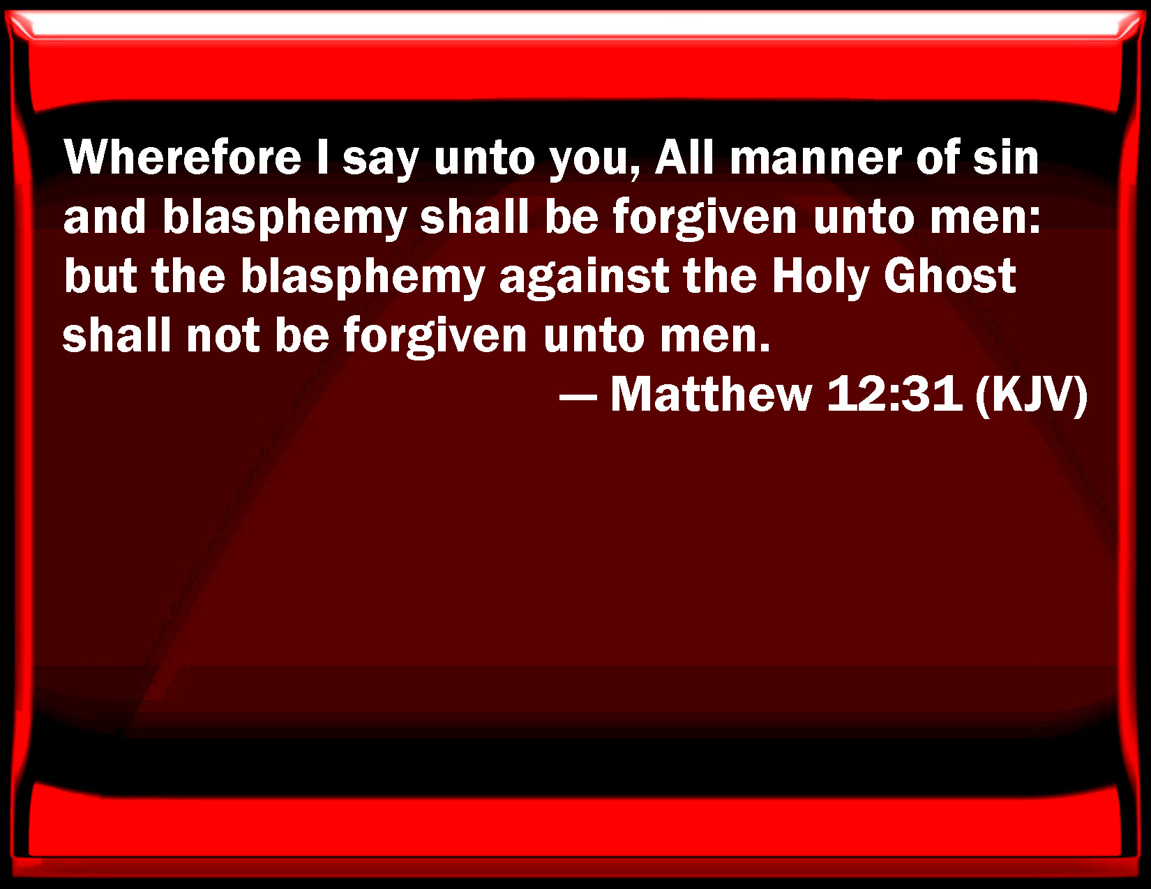 Bible Verse Slide Matthew 12:31 Why I say to you, All manner of sin and blasphemy shall be forgiven to men: but the blasphemy against the Holy Ghost shall not be forgiven to men. KJV: Wherefore I say unto you, All manner of sin and blasphemy shall be forgiven unto men: but the blasphemy against the Holy Ghost shall not be forgiven unto men. DRB: Therefore I say to you: Every sin and blasphemy shall be forgiven men, but the blasphemy of the Spirit shall not be forgiven. DBT: For this reason I say unto you, Every sin and injurious speaking shall be forgiven to men, but speaking injuriously of the Spirit shall not be forgiven to men. ERV: Therefore I say unto you, Every sin and blasphemy shall be forgiven unto men; but the blasphemy against the Spirit shall not be forgiven. WBT: Wherefore I say to you, All manner of sin and blasphemy shall be forgiven to men: but the blasphemy against the Holy Spirit shall not be forgiven to men. WEB: Therefore I tell you, every sin and blasphemy will be forgiven men, but the blasphemy against the Spirit will not be forgiven men. YLT: Because of this I say to you, all sin and evil speaking shall be forgiven to men, but the evil speaking of the Spirit shall not be forgiven to men.Links Matthew 12:31 NIV • Matthew 12:31 NLT • Matthew 12:31 ESV • Matthew 12:31 NASB • Matthew 12:31 KJV • Matthew 12:31 Interlinear • Matthew 12:31 Commentaries • Matthew 12:31 Parallel Texts • Matthew 12:31 Bible Apps • Matthew 12:31 Parallel • Bible Hub |