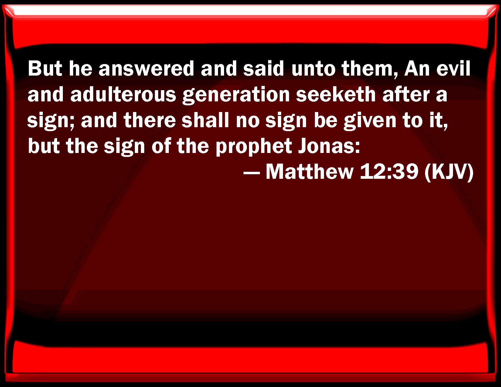 Bible Verse Slide Matthew 12:39 But he answered and said to them, An evil and adulterous generation seeks after a sign; and there shall no sign be given to it, but the sign of the prophet Jonas: KJV: But he answered and said unto them, An evil and adulterous generation seeketh after a sign; and there shall no sign be given to it, but the sign of the prophet Jonas: DRB: Who answering said to them: An evil and adulterous generation seeketh a sign: and a sign shall not be given it, but the sign of Jonas the prophet. DBT: But he, answering, said to them, A wicked and adulterous generation seeks after a sign, and a sign shall not be given to it save the sign of Jonas the prophet. ERV: But he answered and said unto them, An evil and adulterous generation seeketh after a sign; and there shall no sign be given to it but the sign of Jonah the prophet: WBT: But he answered and said to them, An evil and adulterous generation seeketh for a sign, and there shall no sign be given to it, but the sign of the prophet Jonah. WEB: But he answered them, "An evil and adulterous generation seeks after a sign, but no sign will be given it but the sign of Jonah the prophet. YLT: And he answering said to them, 'A generation, evil and adulterous, doth seek a sign, and a sign shall not be given to it, except the sign of Jonah the prophet;Links Matthew 12:39 NIV • Matthew 12:39 NLT • Matthew 12:39 ESV • Matthew 12:39 NASB • Matthew 12:39 KJV • Matthew 12:39 Interlinear • Matthew 12:39 Commentaries • Matthew 12:39 Parallel Texts • Matthew 12:39 Bible Apps • Matthew 12:39 Parallel • Bible Hub |